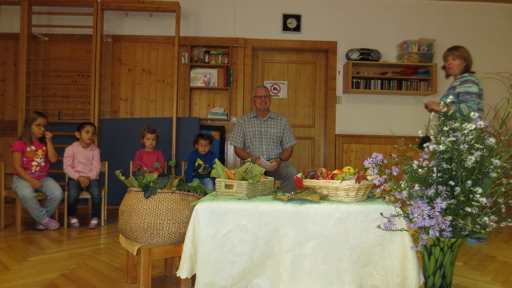 Mit viel Freude feierten die Kindergarten- und Krabbelstubenkinder von Steyrermühl Erntedank. Für die mitgebrachten Gaben wurde mit Liedern gedankt. Als Vertreter der Pfarre segnete das Seelsorgeteammitglied Rudolf Pülzl die Gaben