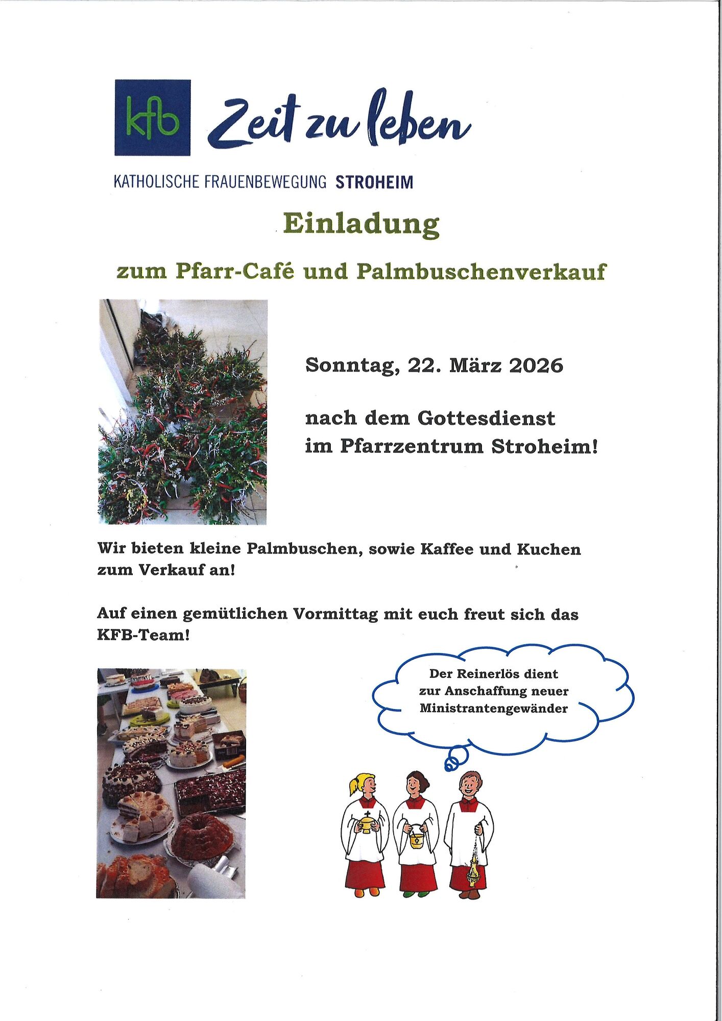 Einladung zum Pfarr-Cafe und Palmbuschenverkauf Einladung zum Pfarr-Cafe und Palmbuschenverkauf. Sonntag, 22. März 2026 nach dem Gottesdienst im Pfarrzentrum Stroheim. mehr: Einladung zum Pfarr-Cafe und Palmbuschenverkauf