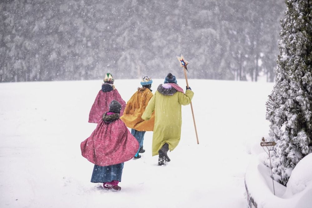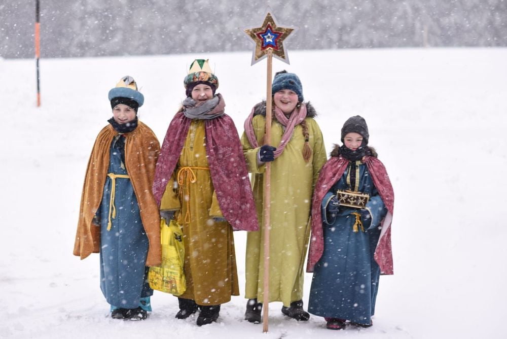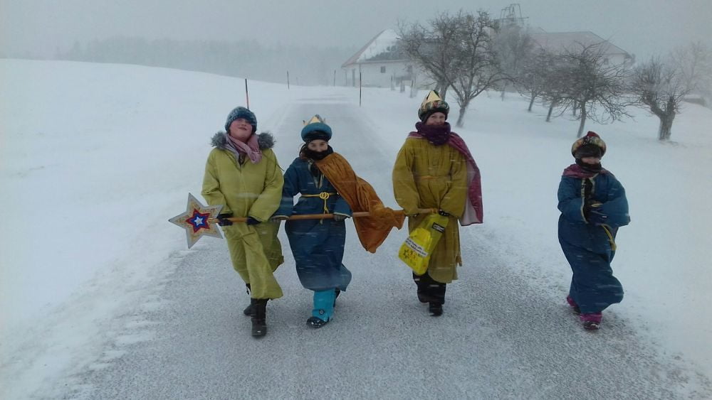 Das Schneetreiben, der kalte Wind und die verschneiten Wege konnten der Stimmung der Sternsinger keinen Abbruch tun, wie die Bilder einer Gruppe beweisen!