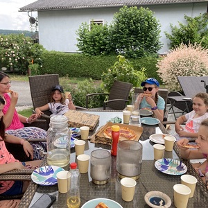 Am Samstag, den 10.6.2023 feierten wir unseren Jungscharabschluss. Zuerst bastelten wir im Pfarrheim für den Vatertag, dann gings zu Fuß nach Rossbach. Bei Romi und Viki angekommen gabs Pizza und Eis und Spiele im Garten.