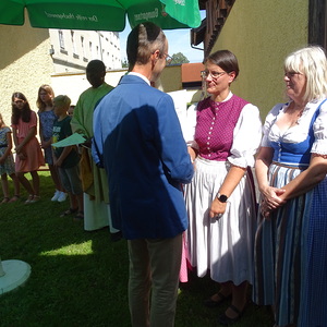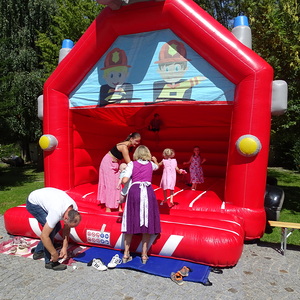 Im Anschluss an den Gottesdienst wurde dann ordentlich gefeiert. Für die Kinder gab es ein tolles Kinderprogramm mit Hüpfburg, Kinderschminken, Basteleien und einem Luftballonstart. Außerdem konnte beim Bücherflohmarkt in der Pfarr- und Gemeindebibliothek interessante Bücher erworben werden. Bei einem Schätzspiel, bei dem die Frage lautete "Wieviele ehrenamtliche Arbeitsminuten wurden im Jahr 2022 in die Kirchensanierung investiert" konnte man tolle Preise gewinnen.