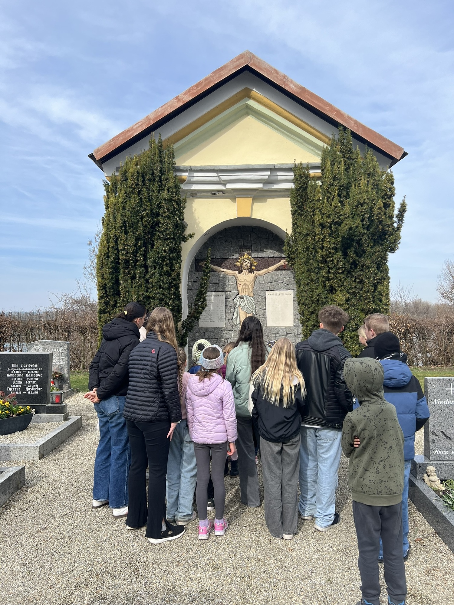 Wo befindet sich das Kriegerdenkmal? Was ist das Franziskanergrab? Wo ist der Friedhof, wo die Kirche und wo die Pfarr- und Gemeindebücherei? Was machen wir in unserem Pfarrhof?