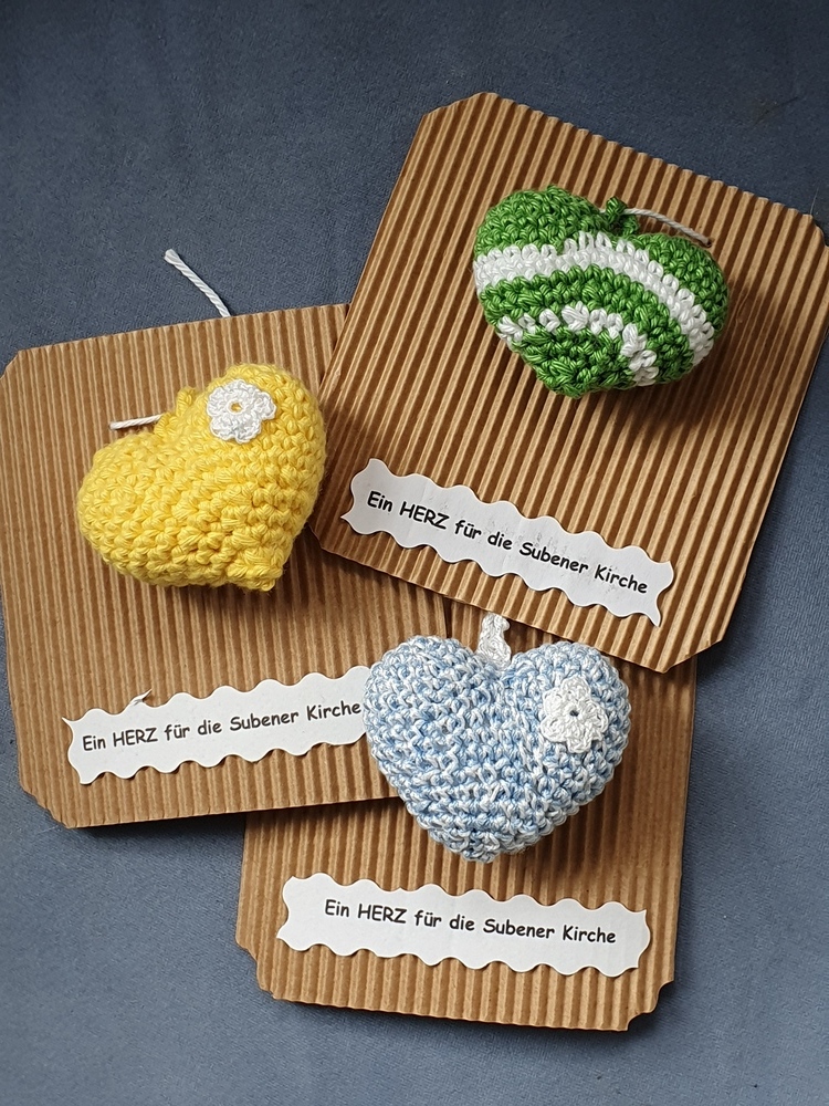 Dazu werden alle Volksschulkinder, die größeren Jungscharkinder und auch die Firmlinge eingeladen selbstgehäkelte Herzen unter dem Motto – EIN HERZ FÜR DIE SUBENER KIRCHE zugunsten der Kirchenrenovierung an Menschen, die sie gerne haben zu verkaufen. Der Verkaufserlös wird von der Jungschar zu Gunsten der Kirchenrsanierung gespendet. Wir bitten euch von ganzem Herzen die Kinder dabei zu unterstützen.