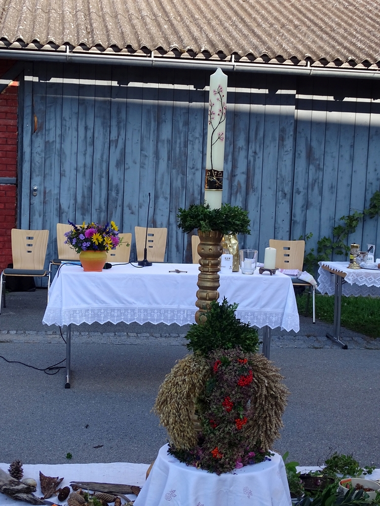 Bei den Vorbereitungen haben viele fleißige "Rossbacher" Hände eine Saat ausgestreut. Im Verborgenen ist die Saat mit Gottes Hilfe zu ihrer Zeit gekeimt und hat uns so geholfen, die vielen Ideen größtenteils zu verwirklichen. Der gute Boden, der vielfach tief empfundenen Festtagsfreude und der strahlende Sonnenschein verhalf uns zu diesem wunderbaren Dankgottesdienst.