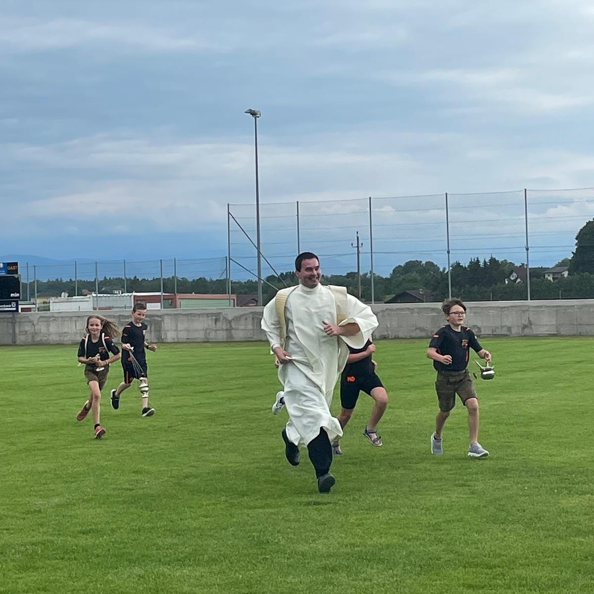 Jung und dynamisch: So erleben wir Kirche in Tarsdorf! Kaplan Franziskus mit seinen Ministrant:innen segnete beim Sportfest am Sa, 22. Juni die vier neuen Objekte am Sportplatz - vom Sportheim bis zum Ökotrail. Sie zeigten gute Kondition und joggten dabei von einer Station zur nächsten.