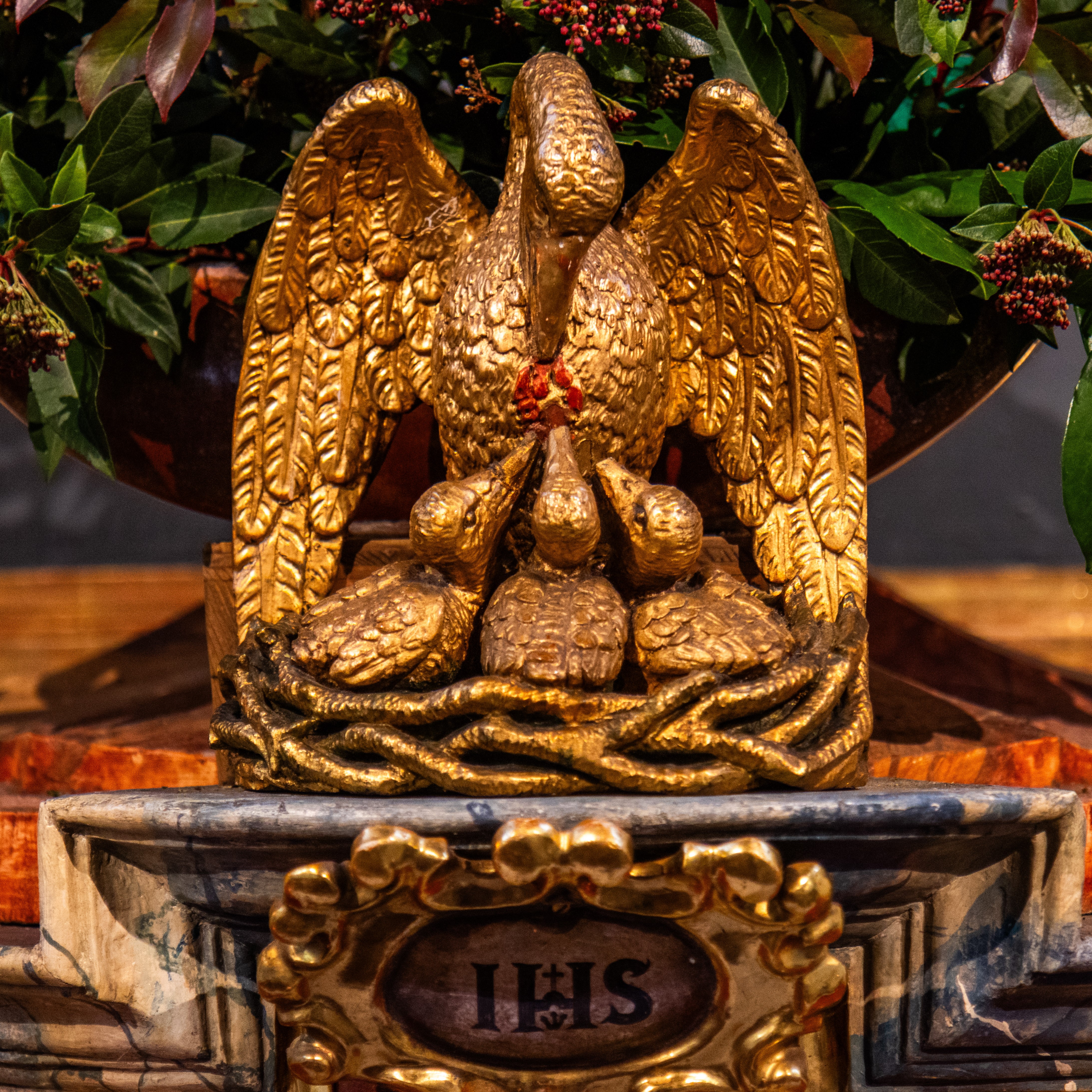 Abgeleitet von Naturbeobachtungen glaubte man früher, dass der Pelikan in Zeiten der Nahrungs knappheit seine eigenen Küken mit dem Blut aus seiner Brust ernährt, indem er sich selbst verwundet, um die Küken zu retten. Besonders im Mittelalter war diese Vorstellung ver breitet und wurde als Sinnbild für die selbst lose Hingabe ein starkes Bild für die göttliche Liebe und Lebenshingabe Christi zur Erlösung der Menschheit.
