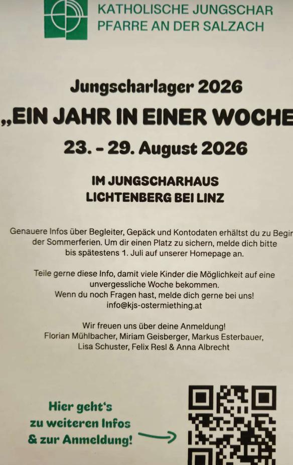 Das Jungscharlager der Pfarre An der Salzach findet heuer von 23. – 29. August in Lichtenberg im Mühlviertel statt. Anmeldungen für Kids ab 8 bis 12 Jahre sind unter: www.kjs-ostermiething.at möglich. Das heurige Motto "Ein Jahr in einer Woche".