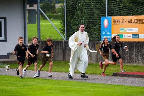 Jung und dynamisch: So erleben wir Kirche in Tarsdorf! Kaplan Franziskus mit seinen Ministrant:innen segnete beim Sportfest am Sa, 22. Juni die vier neuen Objekte am Sportplatz - vom Sportheim bis zum Ökotrail. Sie zeigten gute Kondition und joggten dabei von einer Station zur nächsten.