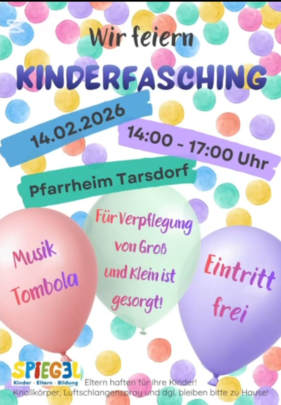 Die Spielgruppe Tarsdorf (SPIEGEL) lädt am Samstag, 14. Februar, zum Kinderfasching ins Pfarrheim! Für Verpflegung von Groß und Klein ist gesorgt. Hier gehts zur Einladung. Mehr Infos zu den Eltern-Kind-Gruppen findest du hier.