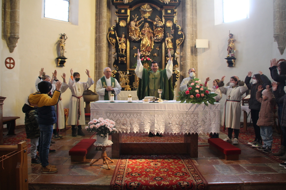 Mit schwungvollen Liedern, Flöten-, Gitarren-, Orgel- und Klarinettenklängen sowie Bewegungselementen für die Kinder wurde der Gottesdienst zum besonderen Erlebnis. Zum Schluss gab es Luftballons für die Kleinen. Danke für die schöne Gestaltung an Kaplan Franziskus und Margit Kneißl, Daniela Kneißl (Gitarre), Daniela und Katharina Auer (Flöte & Klarinette) sowie Johnny Niederreiter.