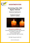 Um das Licht, das die Nacht erhellt, geht es in dieser Stunde. Die Adventzeit ist voll Sehnsucht nach Licht. Wir spüren es besonders in diesen dunklen Tagen. Es soll wieder eine Stunde der Besinnung sein inmitten einer Zeit zunehmender Dunkelheit. Die Bilder, die wir sehen werden und die dazu passenden Gedanken werden uns helfen zur Ruhe zu kommen. Das Quartett Flexibile möchte in bewährter Form und Tonlage diese Impulse vertiefen.