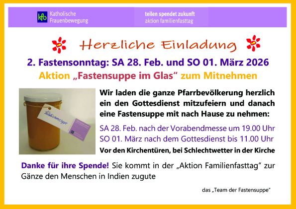 Die Aktion Familienfasttag 2026 ruft zum solidarischen Teilen auf , um diese wichtige Unterstützung weiter zu ermöglichen. Die Spende , die Sie für die Fastensuppe geben, kommt zur Gänze der Aktion Familienfasttag zu Gute.
