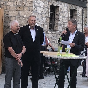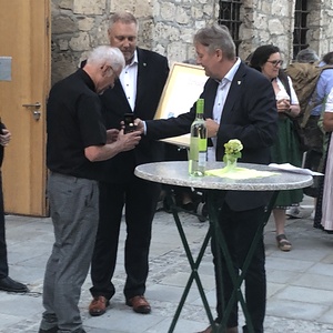 Neben den vielen Gratulationen an Pater Samuel gab es dann noch einen Höhepunkt am Kirchenplatz: Pfarrer Mag. Friedrich Lenhart erhielt von der Gemeinde eine große Ehrung, nämlich die Verleihung des Ehrenrings der Marktgemeinde Ternberg samt Urkunde und wertschätzenden Worten durch Kulturobmann Andreas Ahrer und Bürgermeister Steindler.