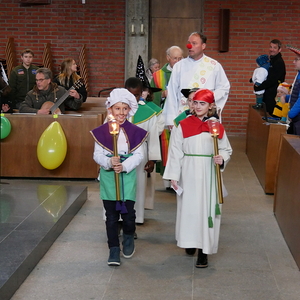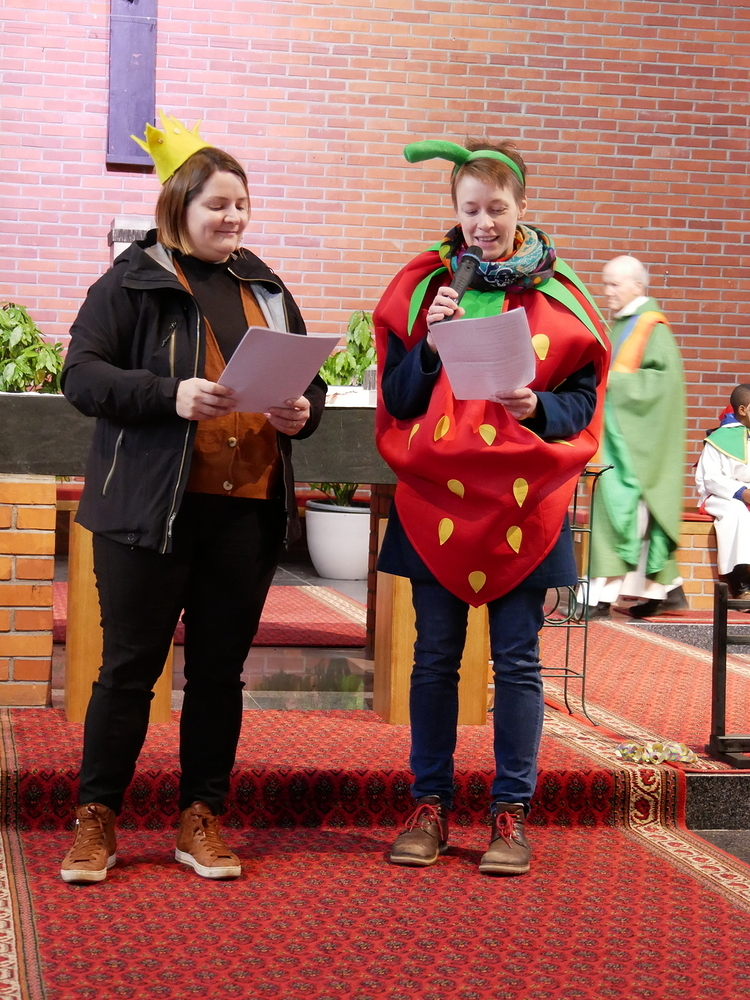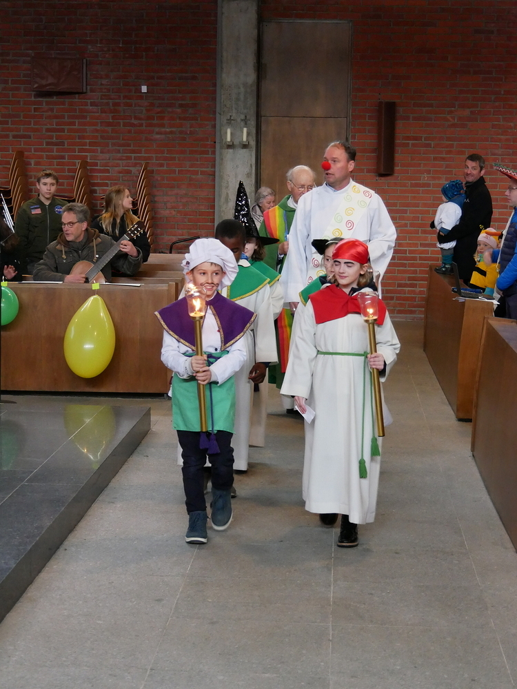 Passend zum Fasching wurden Luftschlagen, Luftballons und Verkleidungen in den gut besuchten Familiengottesdienst eingebaut. Die kleinen (und großen) Zuhörer*innen lauschten gebannt der verrückt-bunten Geschichte von Mr. Quatschkopf und dem Quatschpokal. Fröhliche Fürbitten und Gedanken zum Lachen rundeten den Gottesdienst ab.