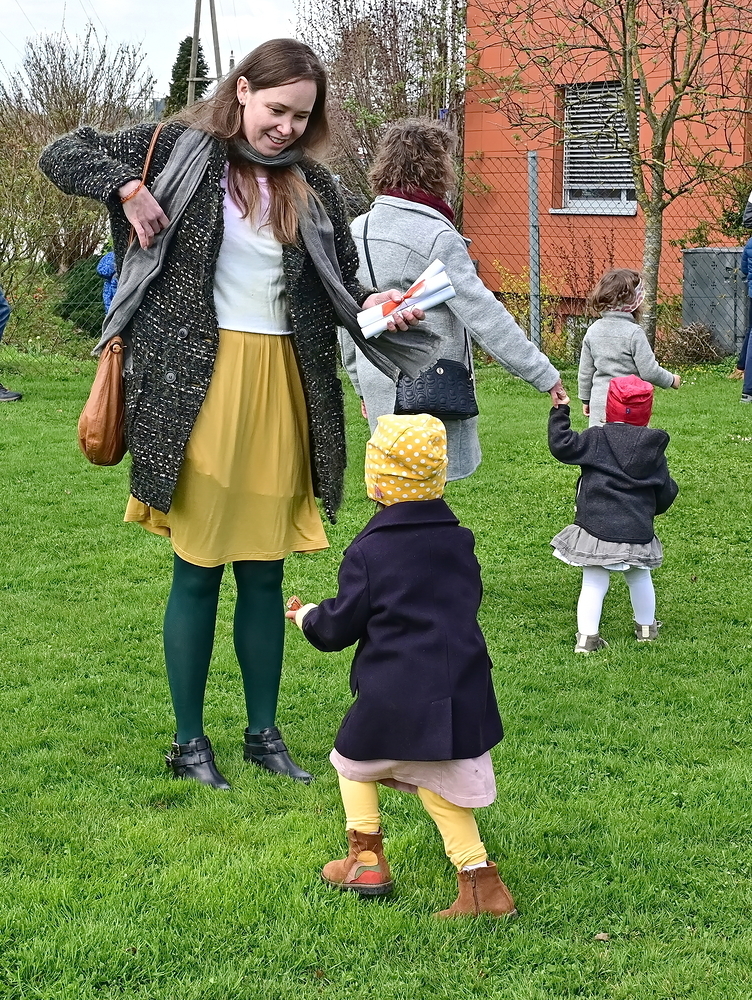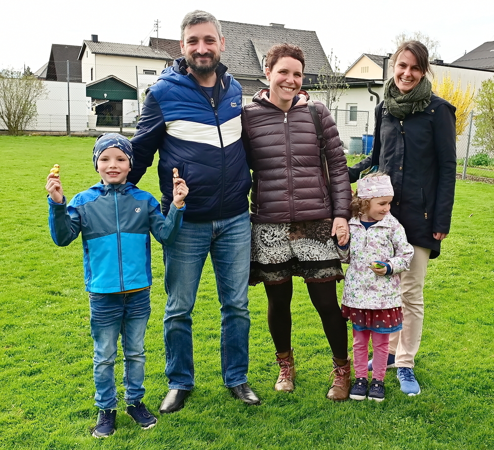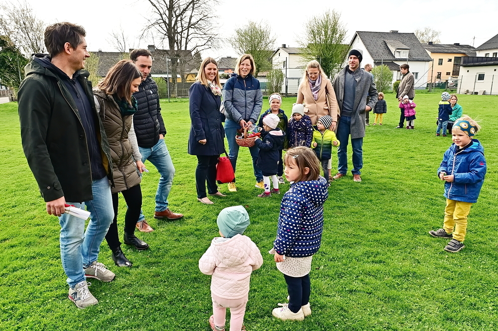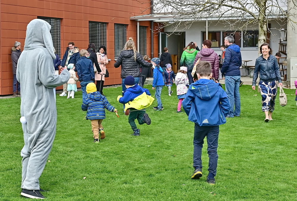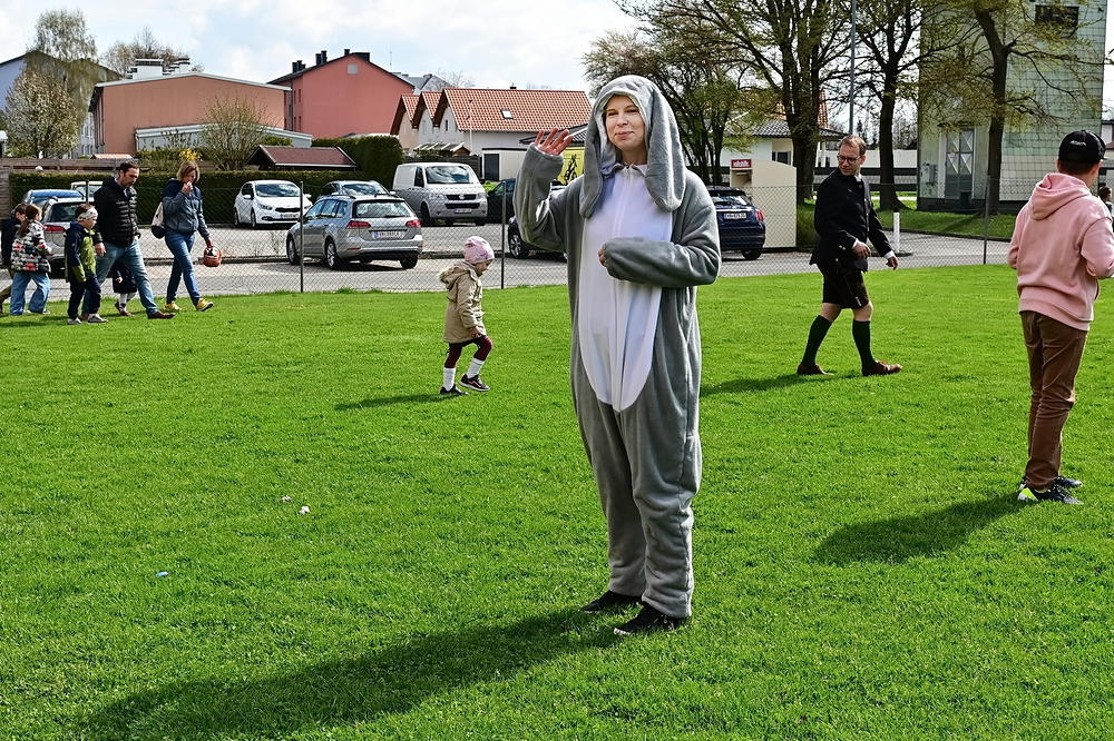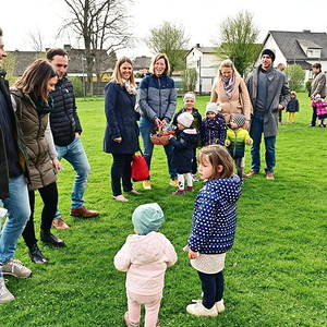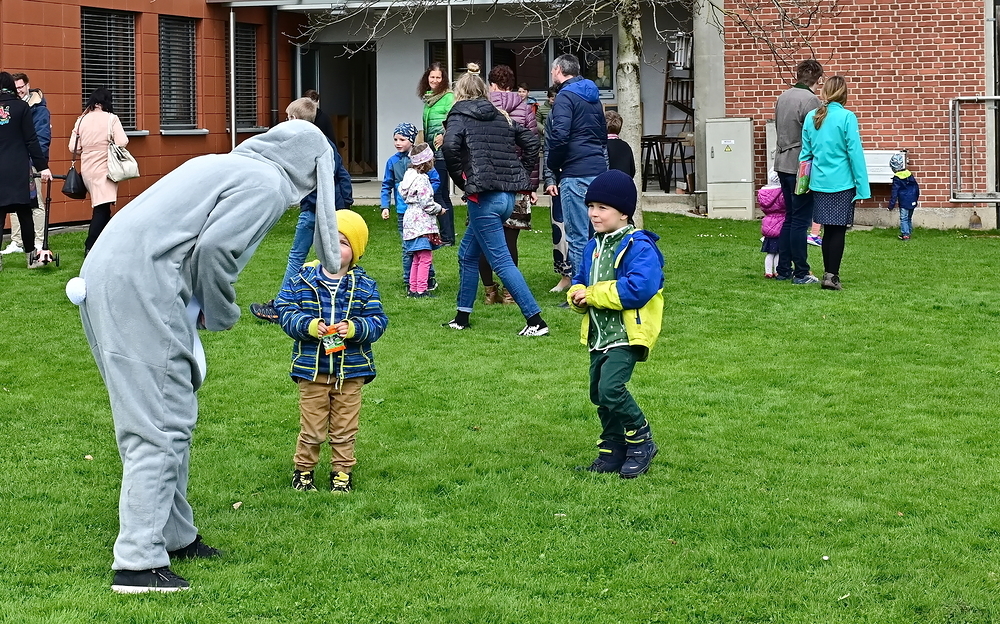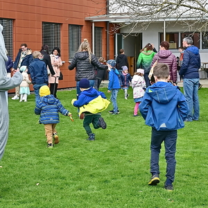 Zum Abschluss sangen und tanzten wir ein letztes Mal zum Lied „Stell dich in die Sonne“, bevor dann alle Kinder mit unserem Osterhasen Sabine auf der Pfarrwiese die versteckten Ostersüßigkeiten suchten.