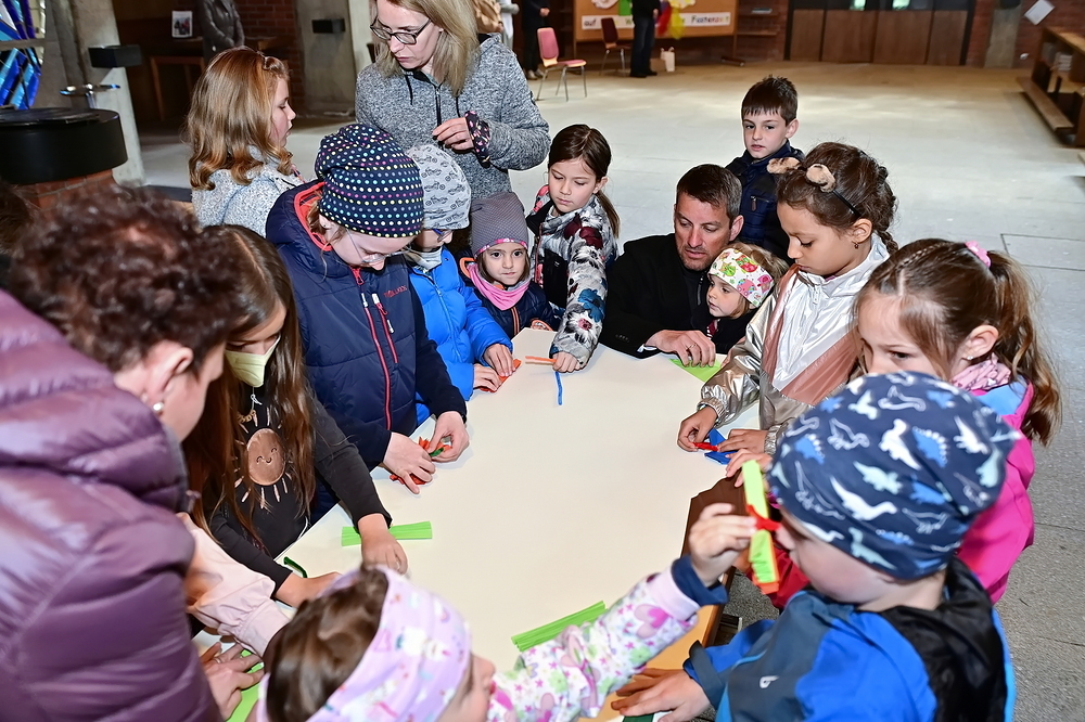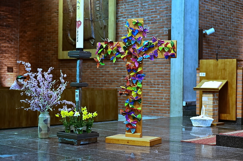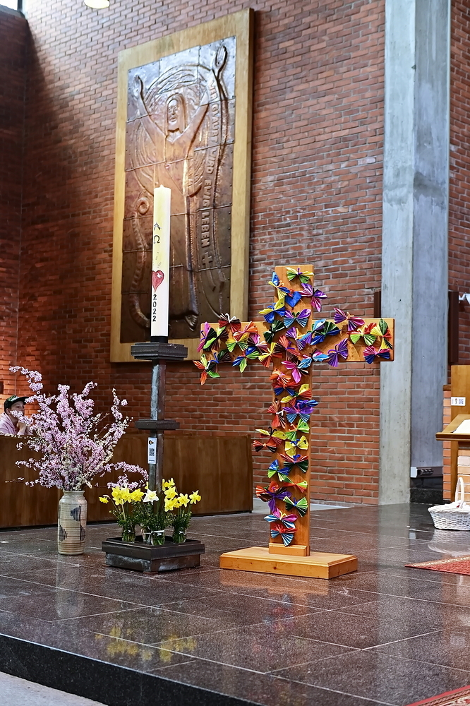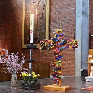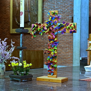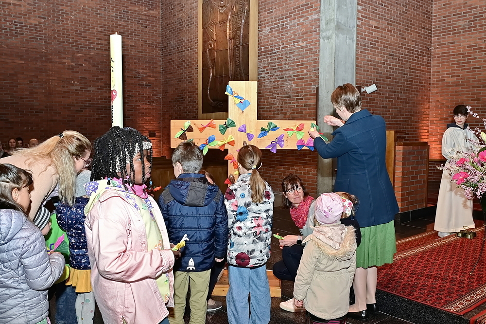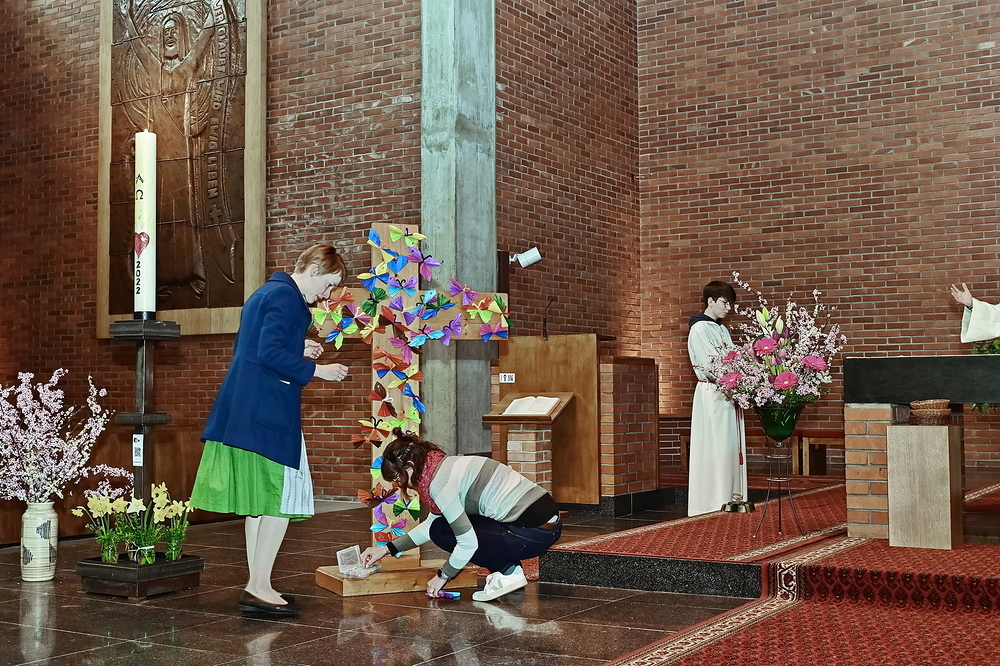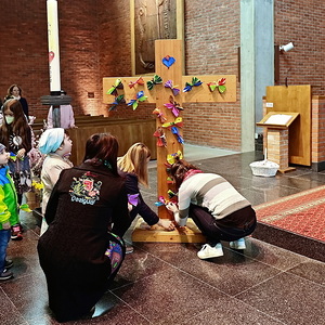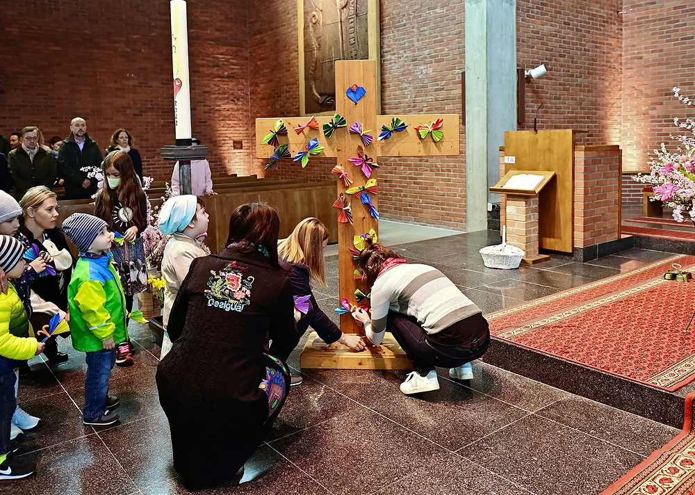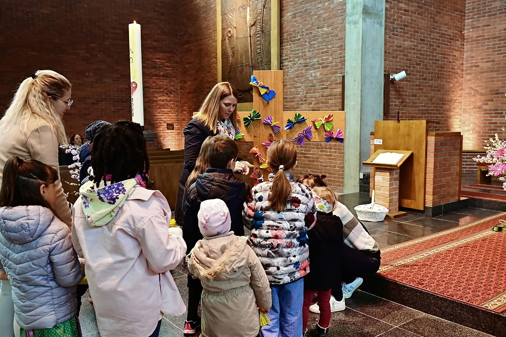 Während der Predigt durften alle Kinder noch einen bunten Schmetterling basteln und damit das Kreuz im Altarraum schmücken.