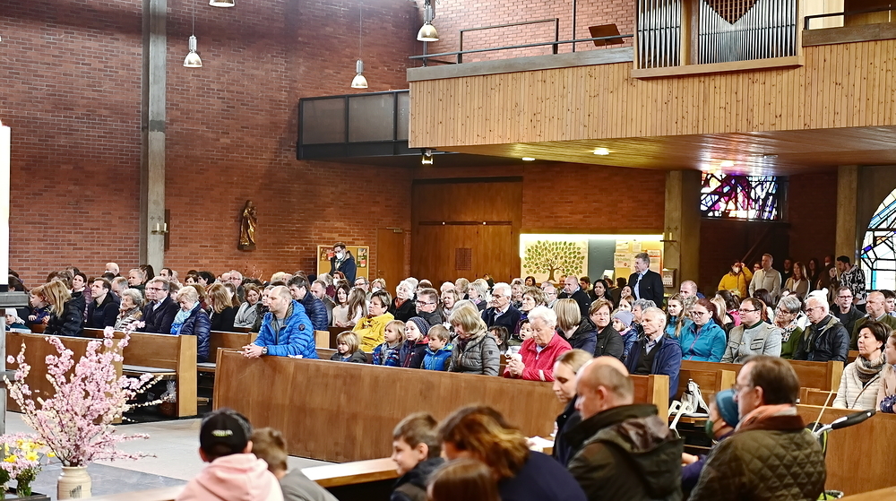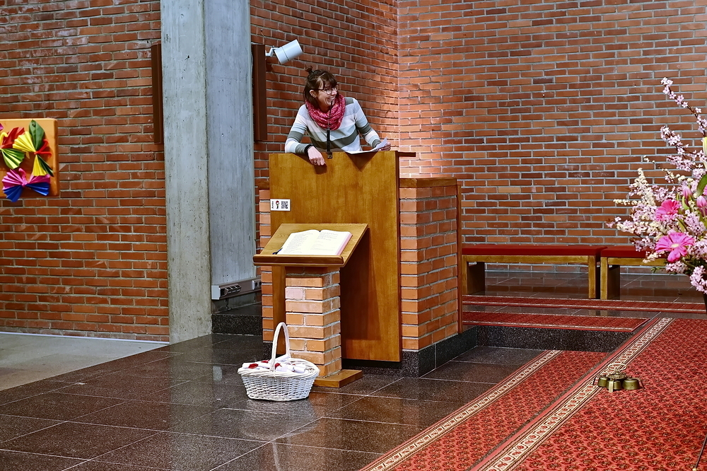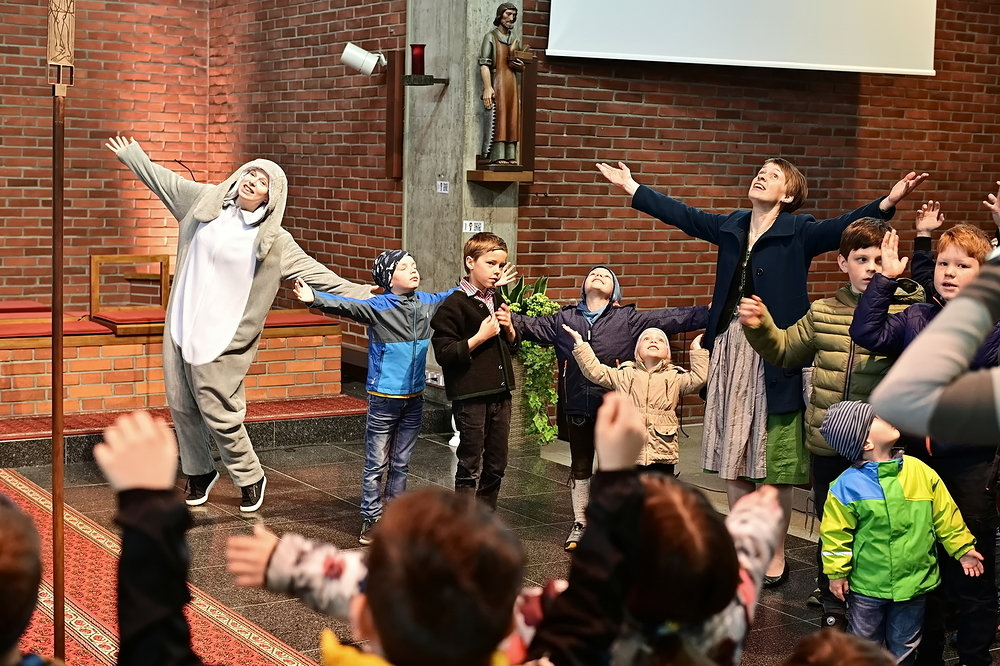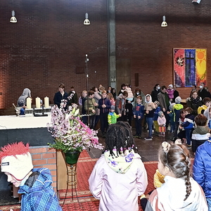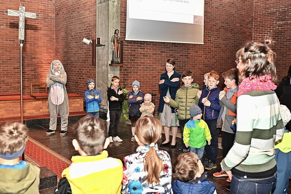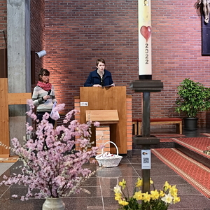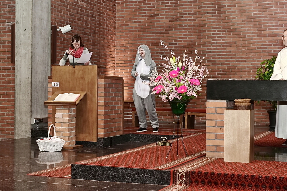 Während des Gottesdienst hörten wir die Geschichte von Mia, Theo und der Osterraupe.