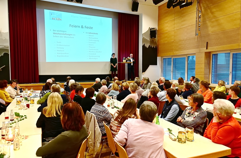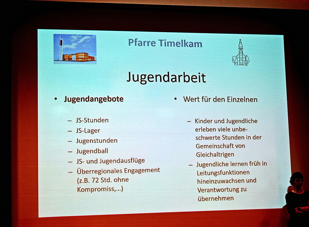 Pfarrer Hans Ortner, PGR-Obmann Alois Hangler und seine Stellvertreterin Maria Voglauer stellten in einem kurzweiligen Fotobericht mit verschiedenen Schwerpunkten die in über 45 Aufgabenbereiche gegliederte Arbeit der letzten fünf Jahre vor: