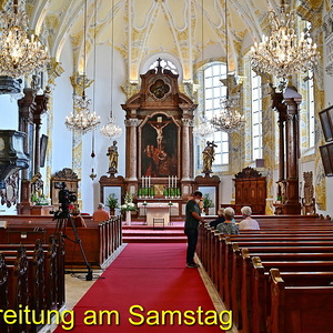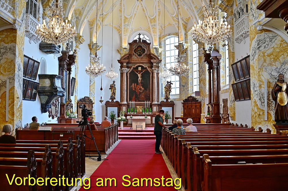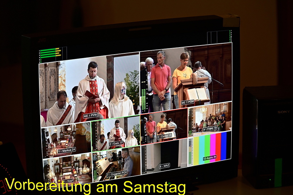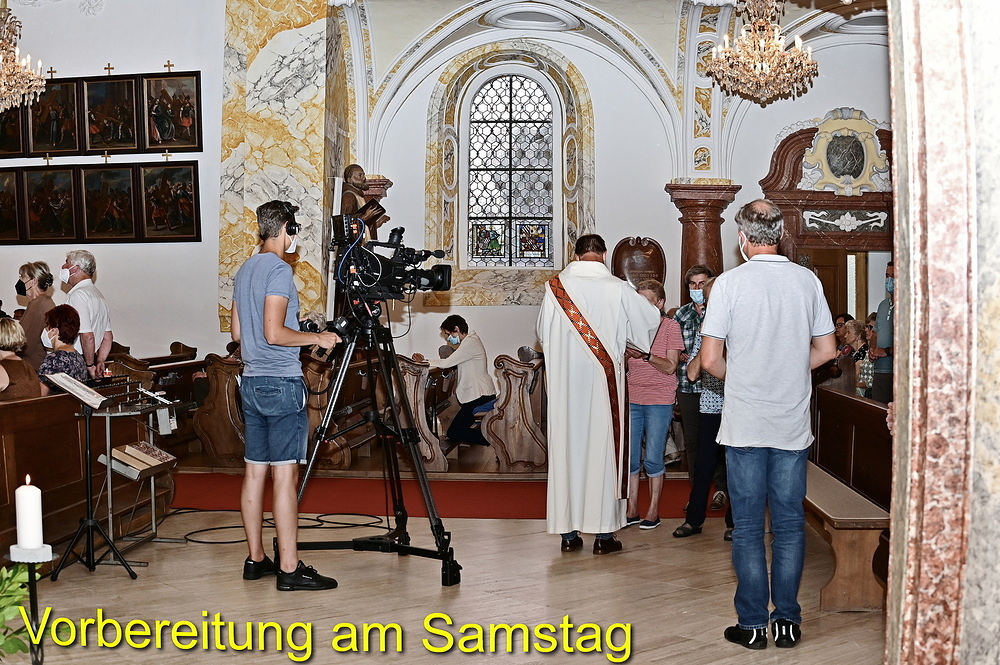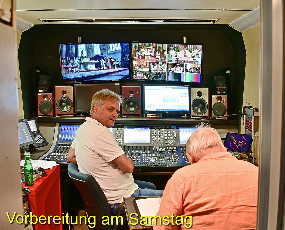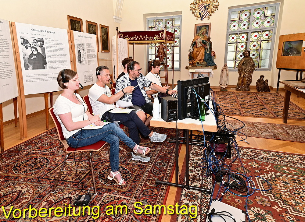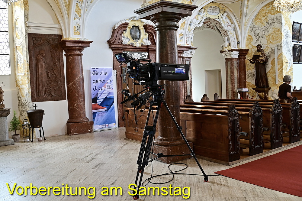 Schon am Samstag herrschte rund um die St. Anna Kirche routinemäßige Hektik beim Aufbau der gesamten Übertragungstechnik. Der große ORF-Wagen und viele hunderte Meter zu verlegende Kabel prägten den Platz um und in der Kirche. Im Refektorium über der Sakristei und im Übertragungswagen herrschte unangefochten das ORF-Team mit der Regietechnik, das die von insgesamt sechs TV-Kameras eingefangenen Szenen fernsehtauglich aufteilte. Die Samstag-Abendmesse um 18:00 Uhr diente als Generalprobe mit einer 1:1 Aufzeichnung. Gleichzeitig waren die „Oberthalheimer Anna-Fest-Organisatoren“ mit der Aufstellung des Festzeltes für den Festtags-Frühschoppen am Werk.