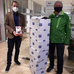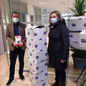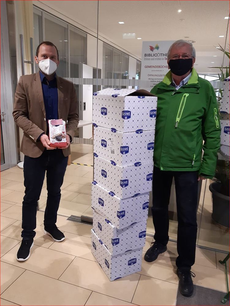 Die Übergabe der Lebkuchen Pakete erfolgte einige Tage vor Weihnachten an den Heimleiter Florian Resch bei der Eingangstür im Altenheim.