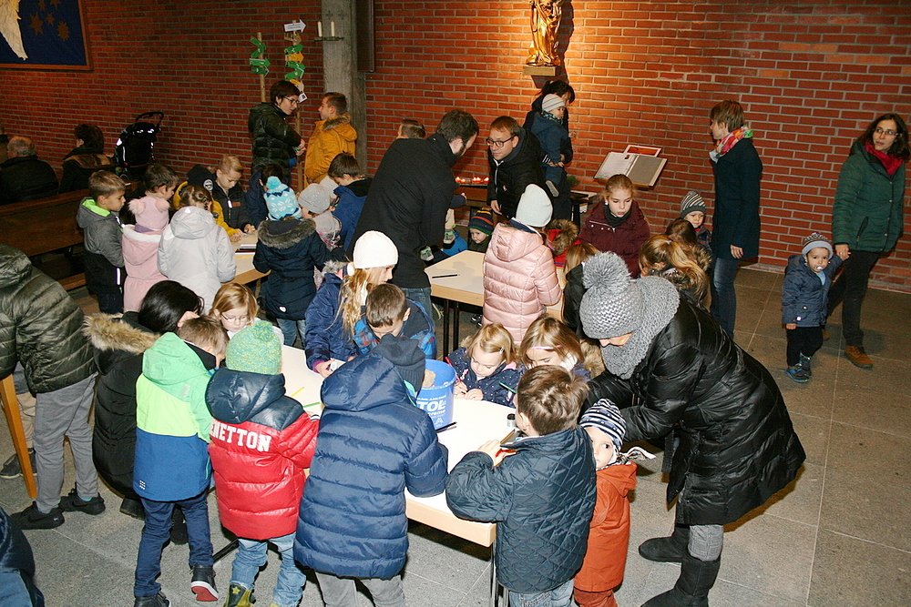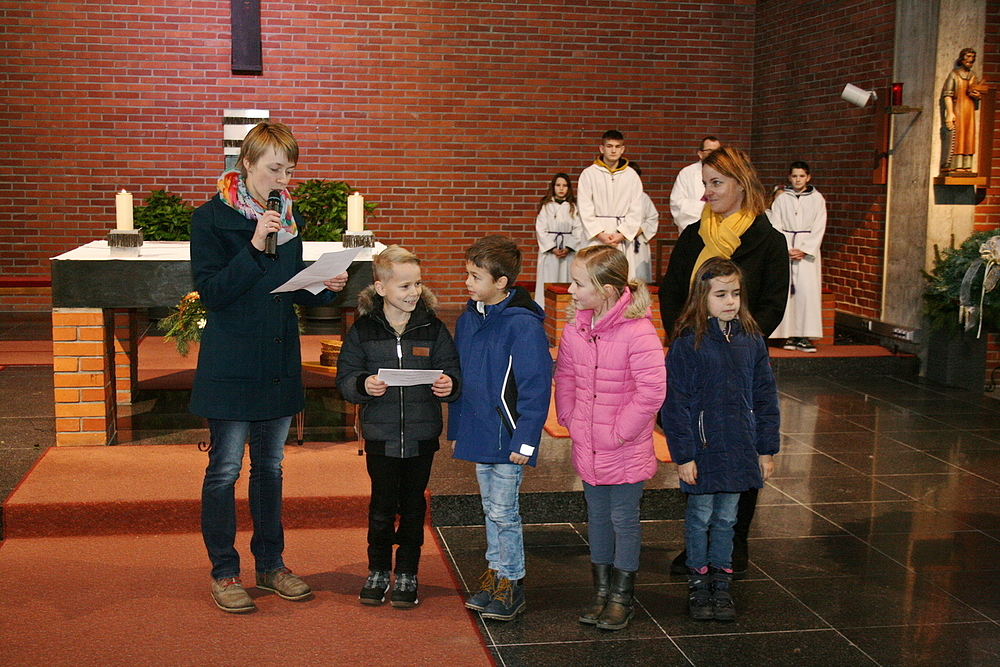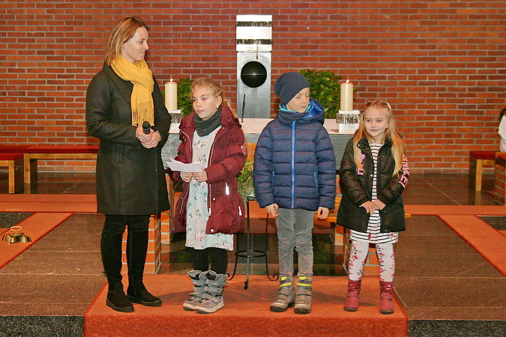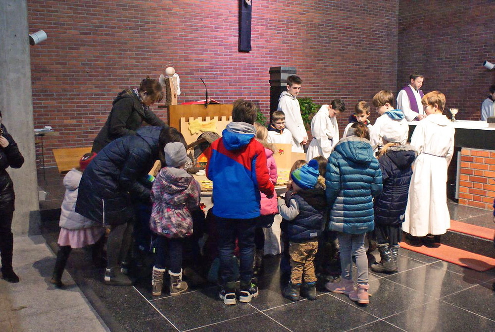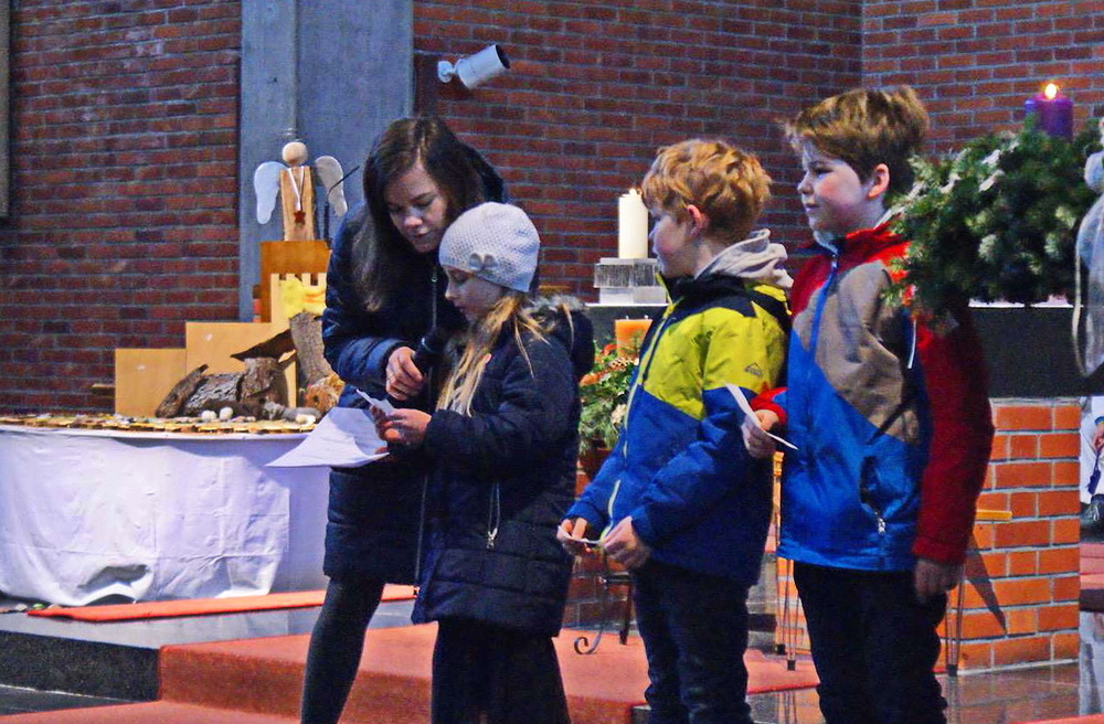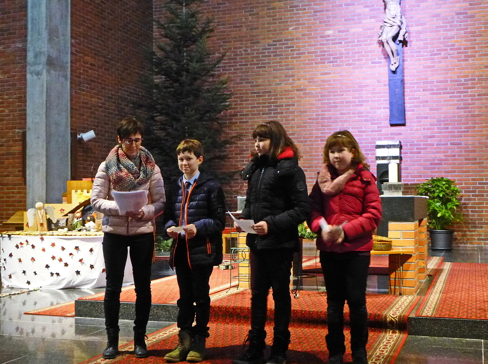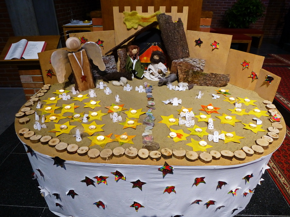 Die Familiengottesdienste sind immer sehr schön von den Musikern untermalt. Am dritten Adventsonntag ist auch zeitgleich die Kinderkirche. Zum Vater Unser kommen auch dann die kleineren Kinder dazu und dürfen ihren Stern bei der Grippe befestigen.