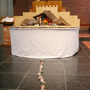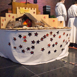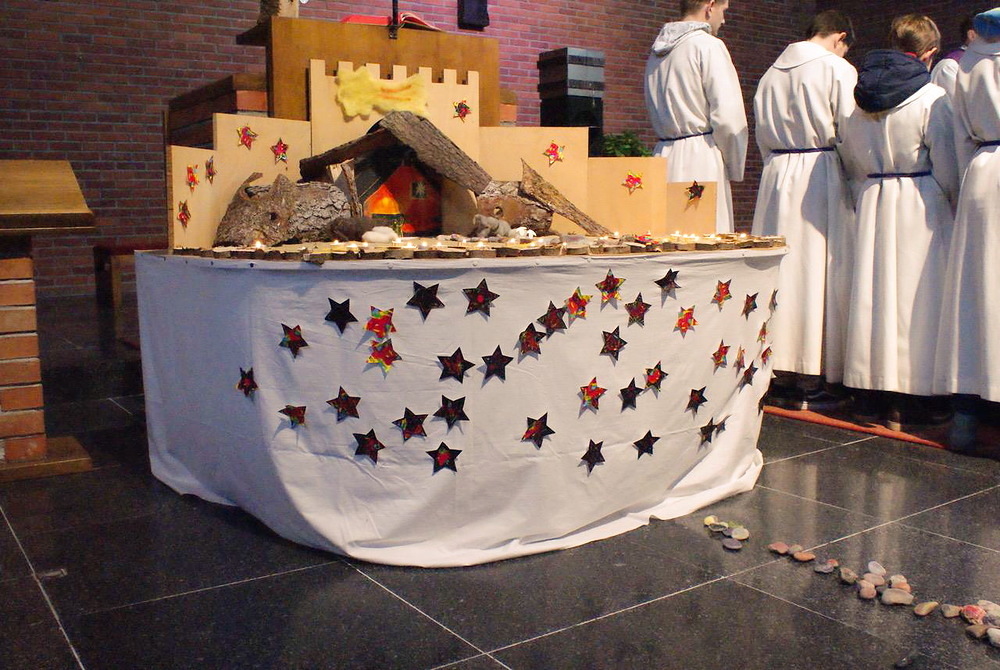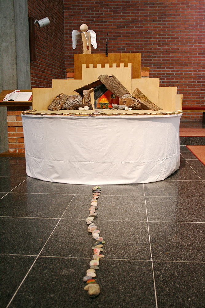 Die Weihnachtskrippe steht beim Altarraum. Diese wird jeden Sonntag weiter geschmückt. Am ersten Adventsonntag bemalen die Kinder Steine und legen vor die Krippe einen Weg auf.