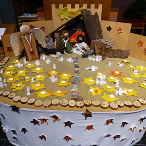 Am dritten Adventsonntag machen die Kinder mit Kratzpapier schöne Sterne und auch diese werden vor dem Vater Unser rund um die Krippe befestigt.