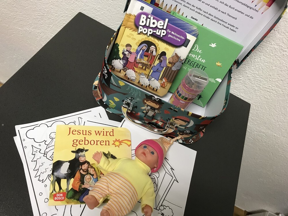„Inhaltlich sind die Materialien im Koffer recht unterschiedlich, jedoch ist jeder mit einem kurzen Elternbrief, einer Inhaltsliste, einem kleinen Buch, ein paar Stiften, einer Malvorlage und einem Spielzeug bestückt,“ erklärt Sabine Kranzinger. Jeder Koffer widmet sich einer anderen biblischen Erzählung, die gut kindertauglich veranschaulicht werden kann. Dazu gehört etwa die Weihnachtsgeschichte, die Geschichte von der Arche Noah, die Erzählung von der Brotvermehrung oder der Segnung der Kinder, aber auch der Schöpfungsbericht und die Geschichten von Mose und Jona.