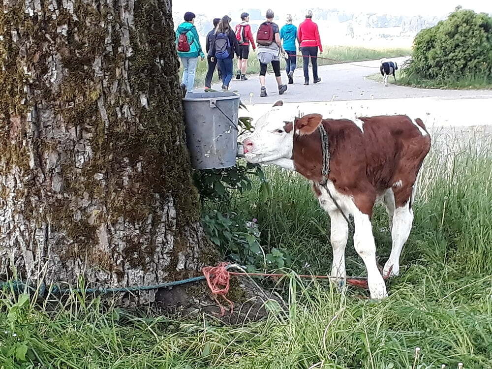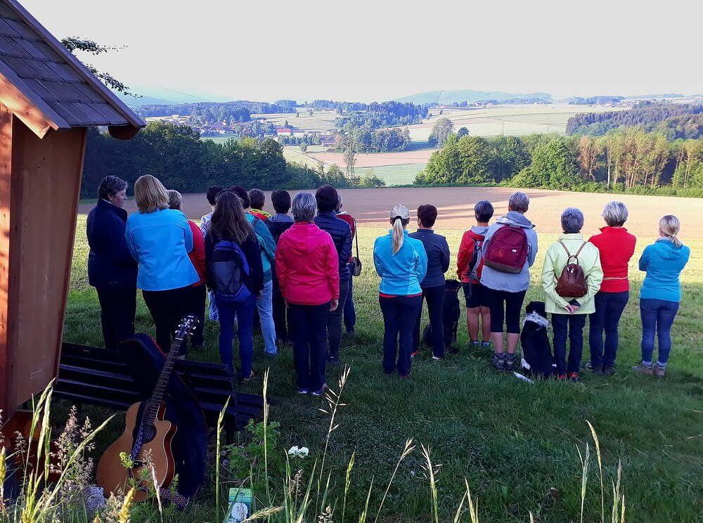 Zwischendurch hörten wir eine Baummeditation, wir sangen bei morgendlichen Sonnenstrahlen den Sonnengesang und genossen den wunderschönen Ausblick vom Marterl in Ader.