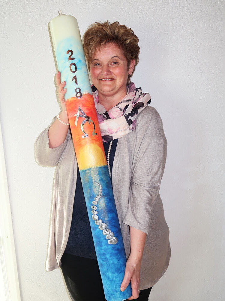 “Bereits kurz nach Ostern mache ich mich wieder auf die Suche nach Ideen und Anregungen für die nächste Osterkerze” meint die kreative Timelkamerin, der bereits zum 18. Mal zu verdanken ist, dass in der Osternacht ein besonderes Kunstwerk geweiht wird.