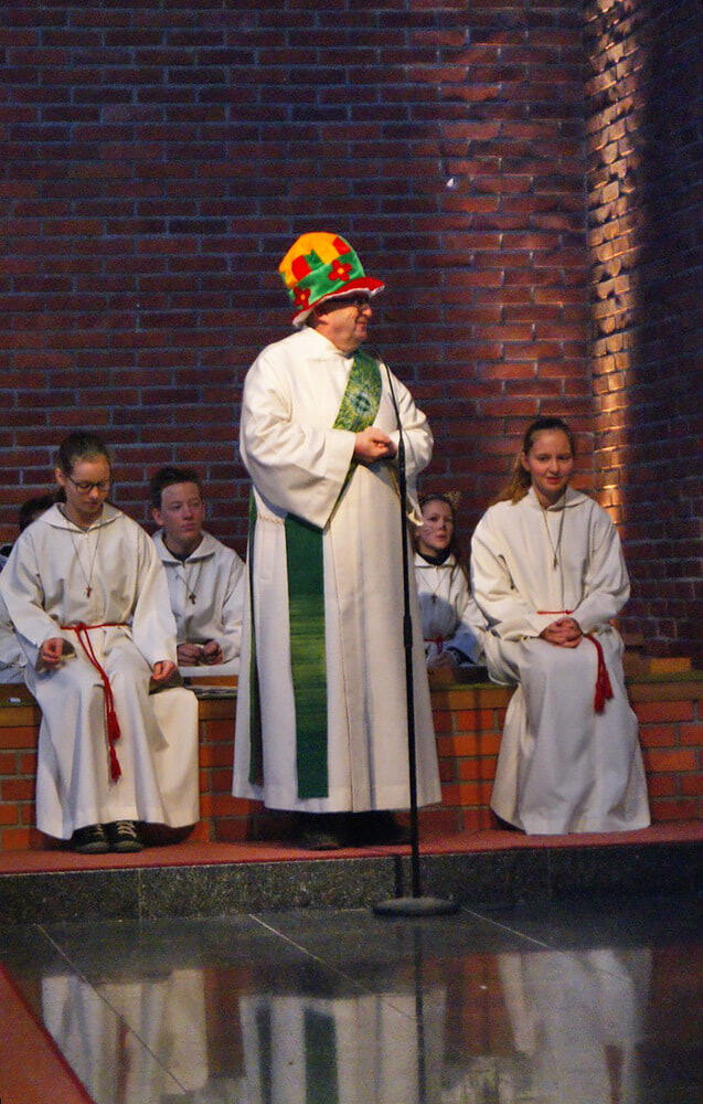 Diakon Herbert Seiringer, der anlässlich der Faschingsmesse verkleidet zum Altar schritt, feierte unter der musikalischen Umrahmung von Sophie und Barbara Eckl den Gottesdienst.