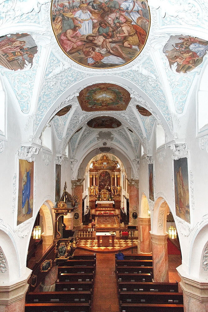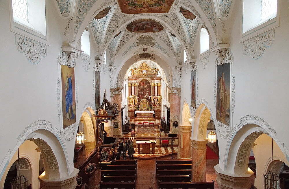 Die schon vor dem Jahre 757 bestehende Holzkirche wurde 1050 durch einen Bau aus Stein ersetzt. Der im 12. Jahrhundert errichtete große romanische Bau wurde nach einem Brand 1276 fast zur Gänze neu im frühgotischen Stil errichtet und um 1700 barockisiert.