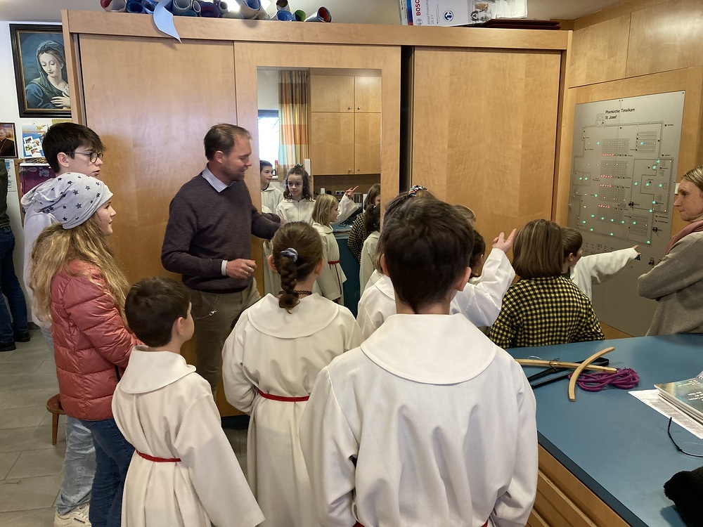 Die Kinder durften dann die essentiellen Gegenstände, die natürlich während des Gottesdienstes nicht fehlen dürfen, ausprobieren. Nach der Einführung in der Sakristei wurde auch schon der richtige Einzug inklusive Aufstellung geprobt.