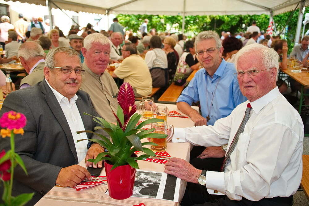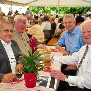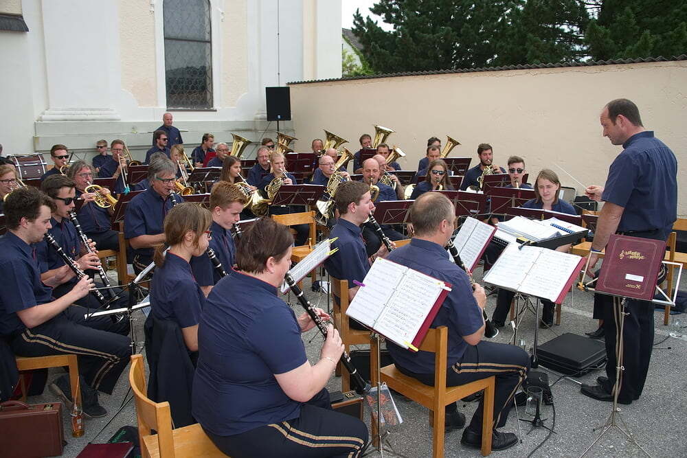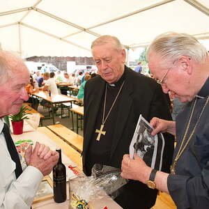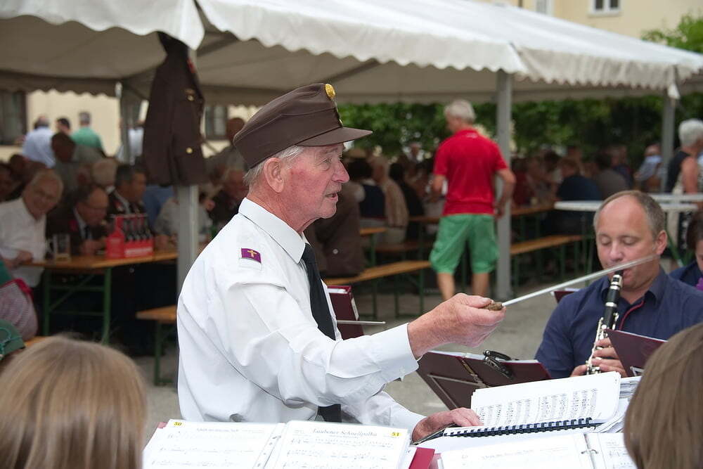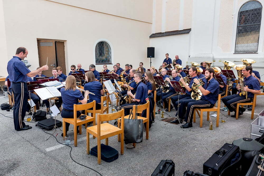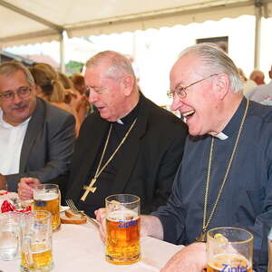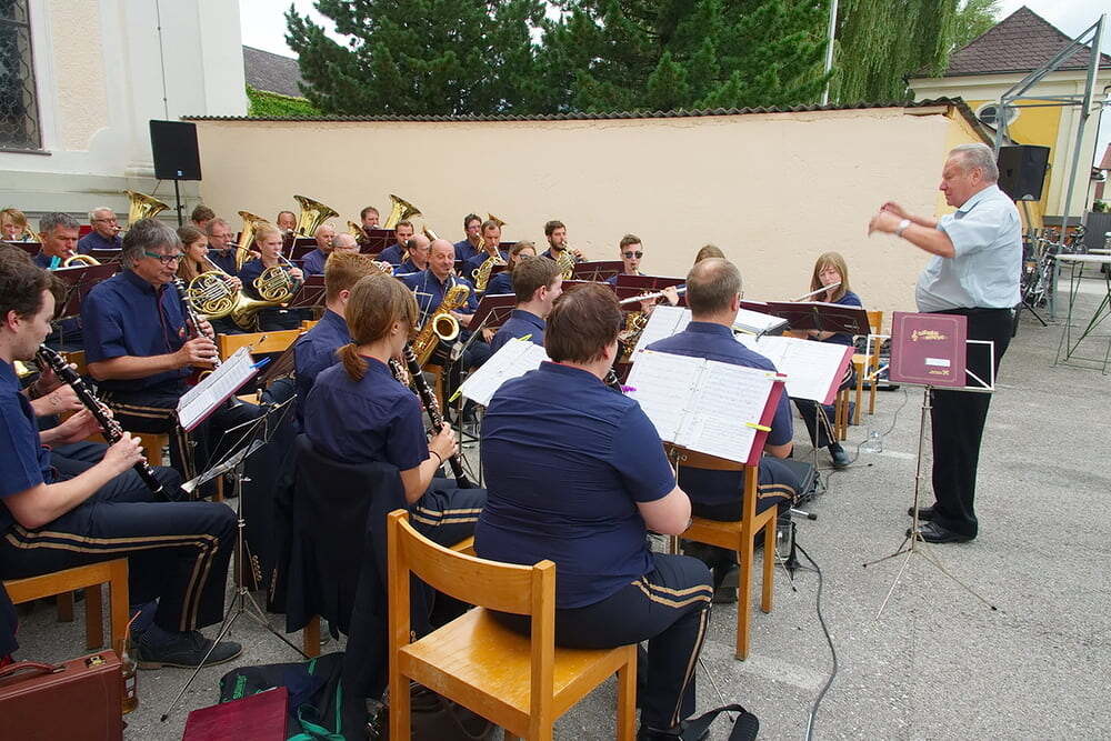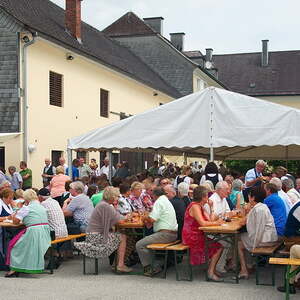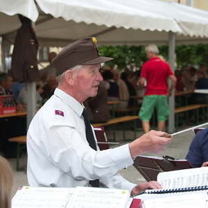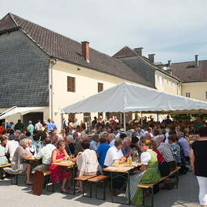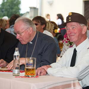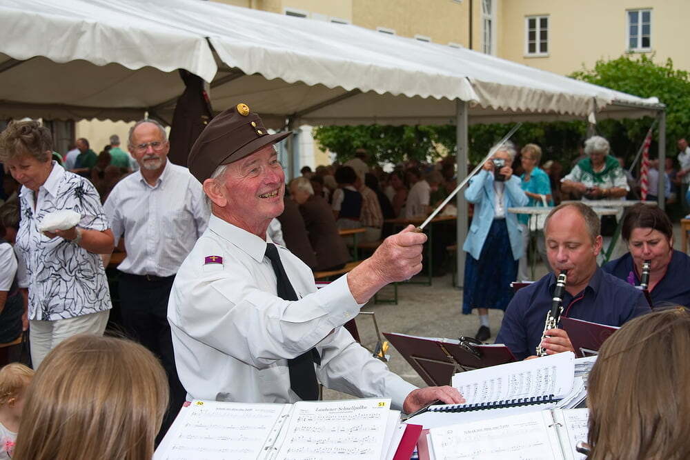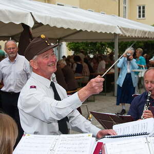 Natürlich wurde beim anschließenden Frühschoppen der Marktmusik Timelkam im Klosterhof noch bis in den Nachmittag weitergefeiert, wobei sich als besonderer Gratulant auch noch Altbischof Ludwig Schwarz, SDB., einstellte.