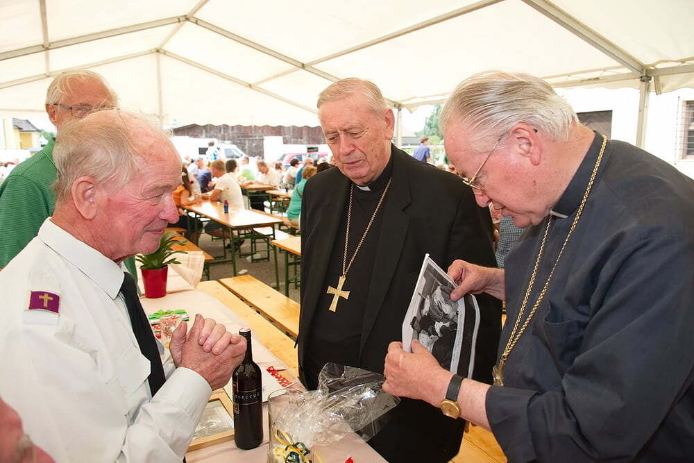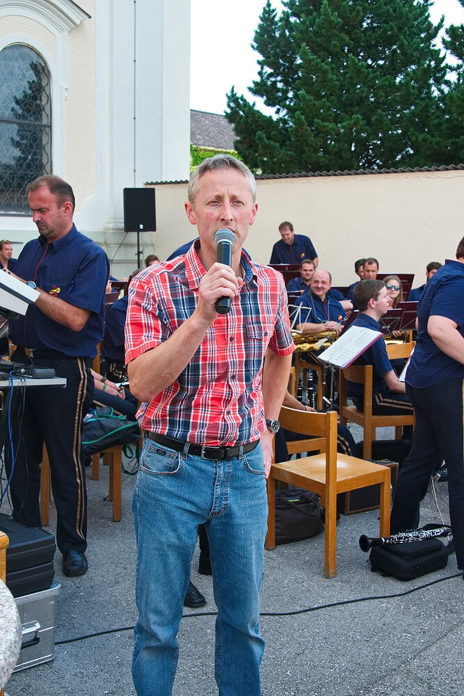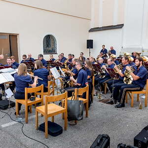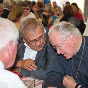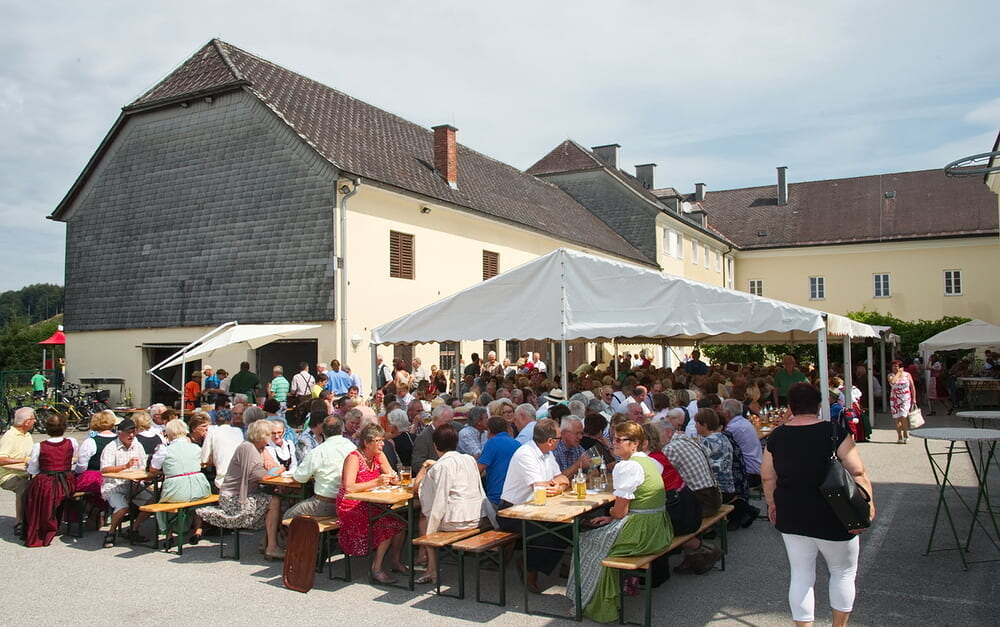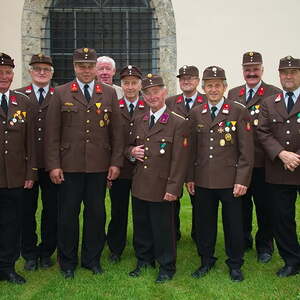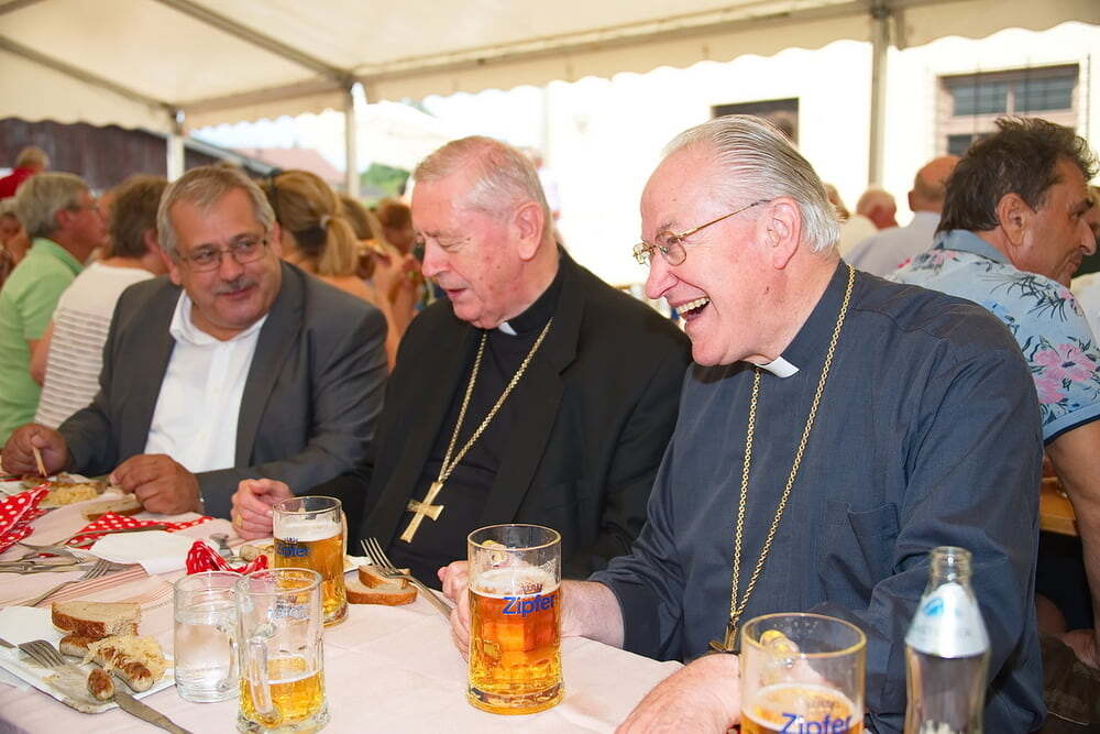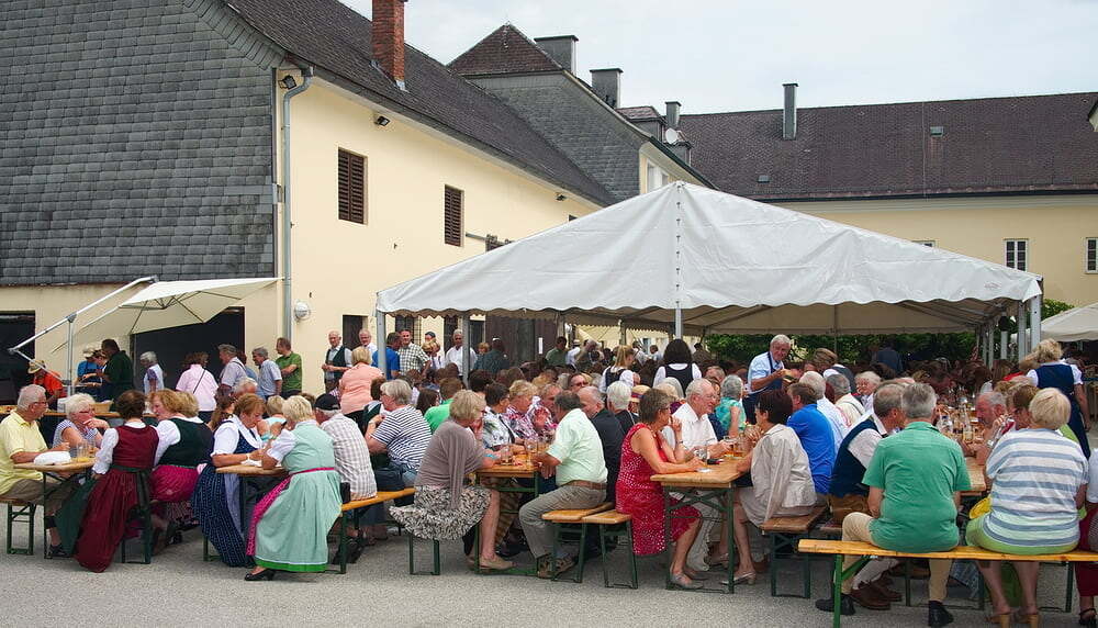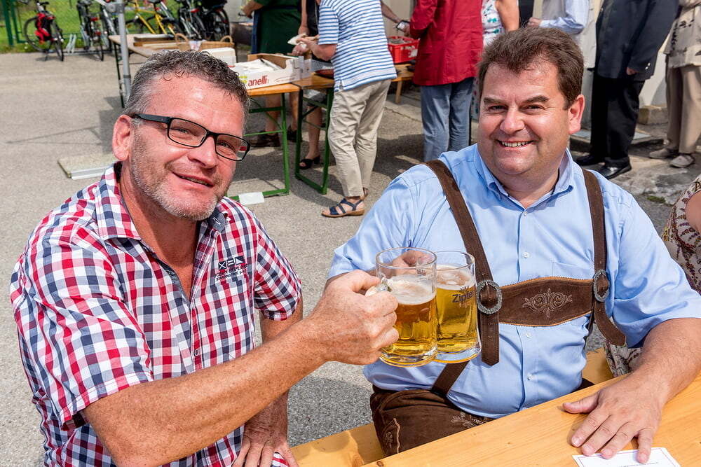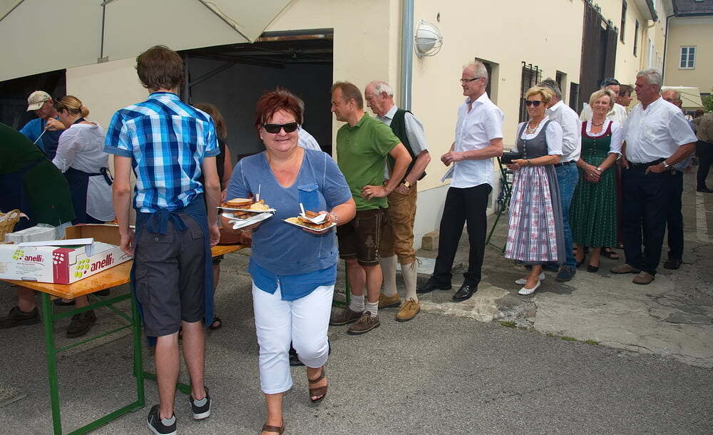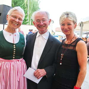 Natürlich wurde beim anschließenden Frühschoppen der Marktmusik Timelkam im Klosterhof noch bis in den Nachmittag weitergefeiert, wobei sich als besonderer Gratulant auch noch Altbischof Ludwig Schwarz, SDB., einstellte.