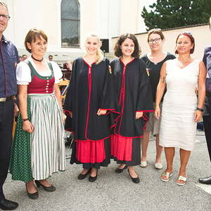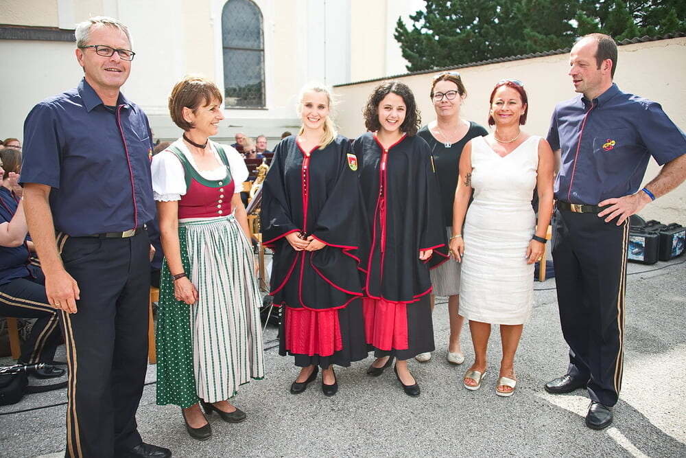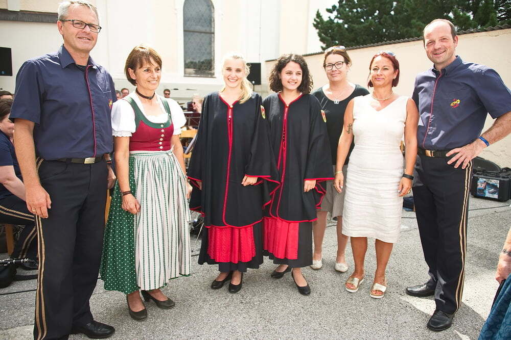 Einen besonderen Grund zur Freude hatte auch die Marktmusik, wurden doch die Marketenderinnen mit fünf wetterfesten Capes ausgestattet, die von der Goldhaubengruppe mit Obfrau Eva Wiesauer und vom Gasthaus Feigl mit Romana Feigl und Petra Rosendahl finanziert wurden.