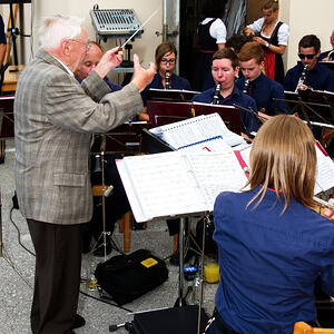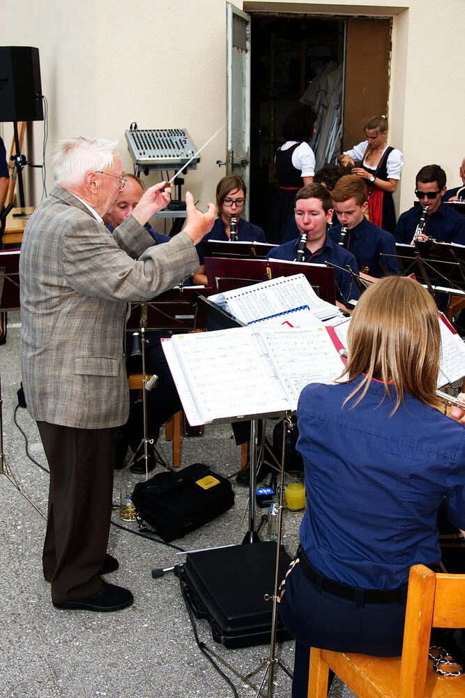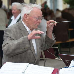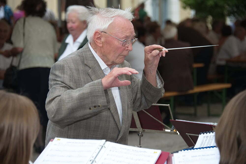 Auch die Marktmusik Timelkam gratulierte dem quicklebendigen Jubilar, indem ihm Kapellmeister Christoph Eckl den Taktstock für einen flotten Marsch übergab.