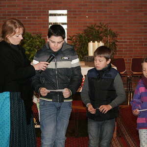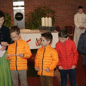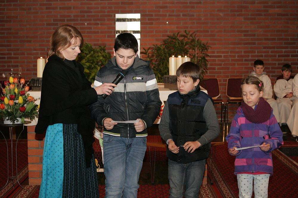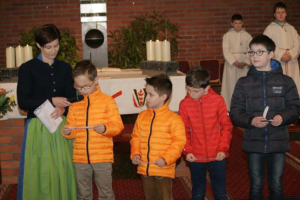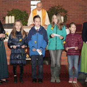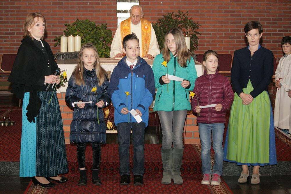 Nach dem Segen und der Speisensegnung durften die Kinder noch Segenswünsche vortragen und die Ostersonne vorne am Altar mit Sonnenstrahlen in Form von Osterglocken erweitern.