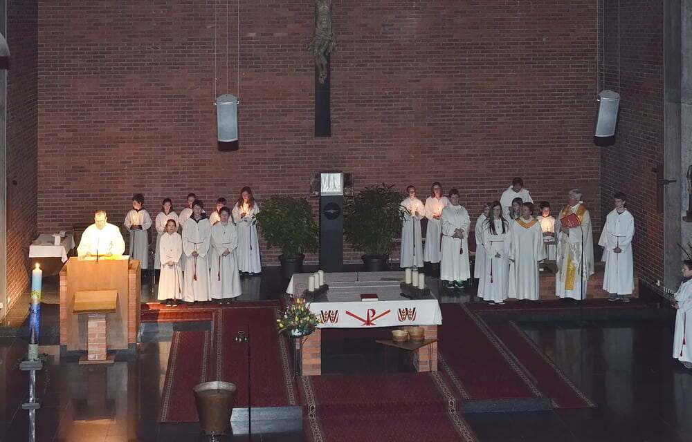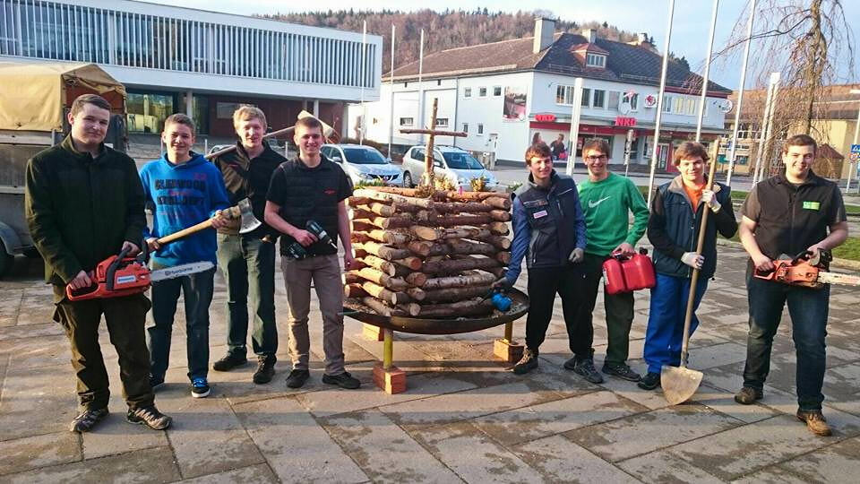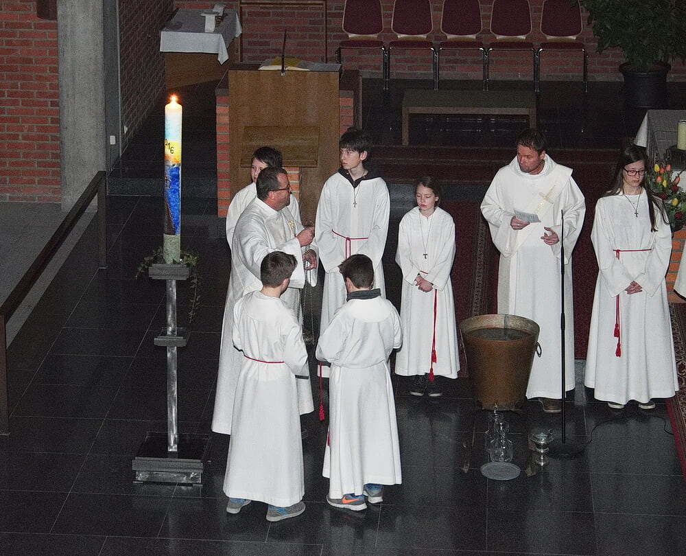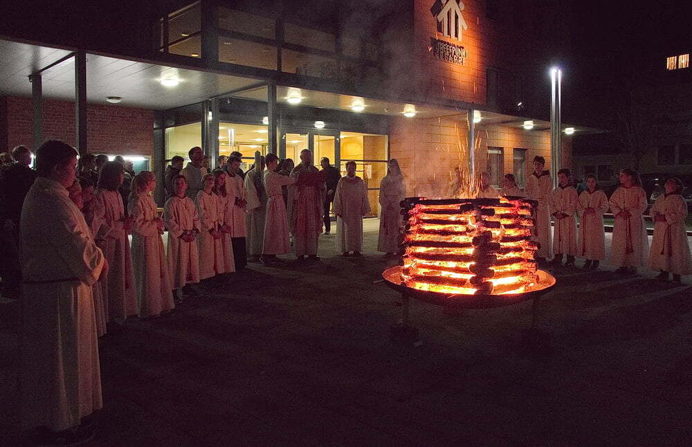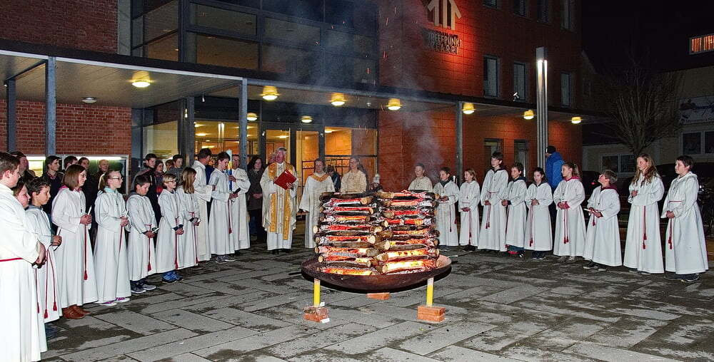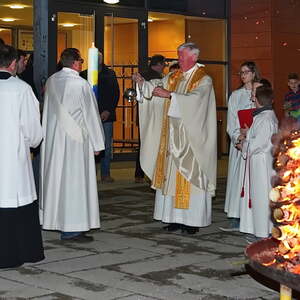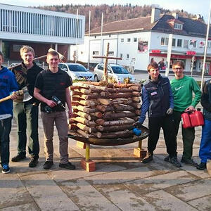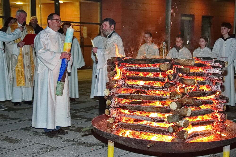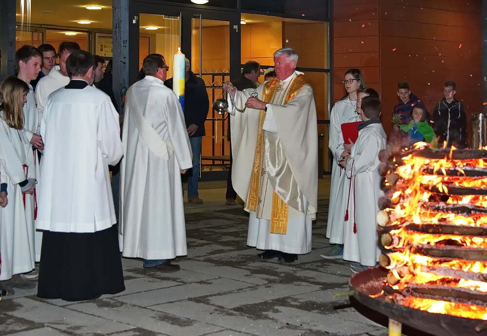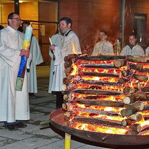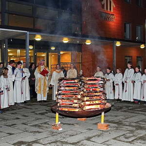 So bereiteten die Jugendlichen am Nachmittag fachgerecht einen entsprechenden „Scheiterhaufen“ vor, um ab ca. 20:00 Uhr auf dem Kirchenplatz ein beeindruckendes Osterfeuer erleben zu können, das übrigens nach der Osternachtsmesse immer noch mit einem Glutnest an dessen Mächtigkeit zu Beginn der Osternacht erinnerte.