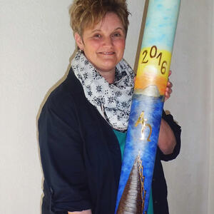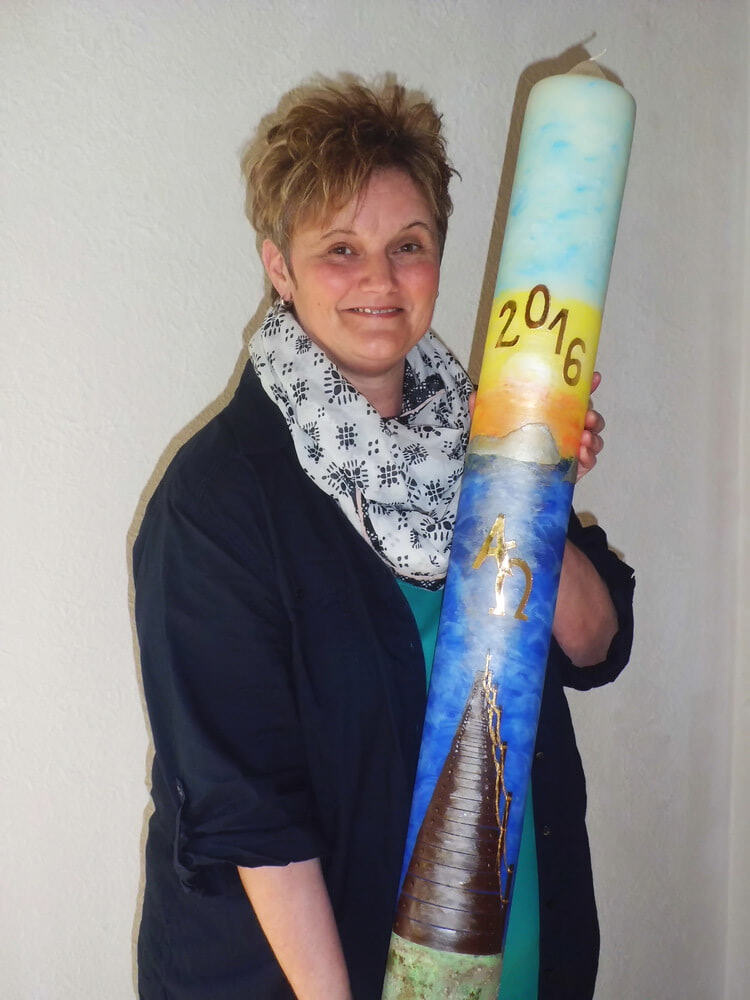 „Ich sitze gerne an einem See und genieße es, wenn sich die Sonnenstrahlen am Wasser spiegeln“ erzählt die Hobby-Künstlerin, die seit dem Jahr 2000 für die Gestaltung der Osterkerze in der katholischen Pfarre Timelkam zuständig ist. „Was eigentlich lediglich als Versuch gedacht war, ist schon zu einer lieb gewordenen Tradition geworden. Da ich ein Motiv nach Möglichkeit kein zweites Mal verwende, wird die Gestaltung jährlich zu einer gewaltigen Herausforderung.“