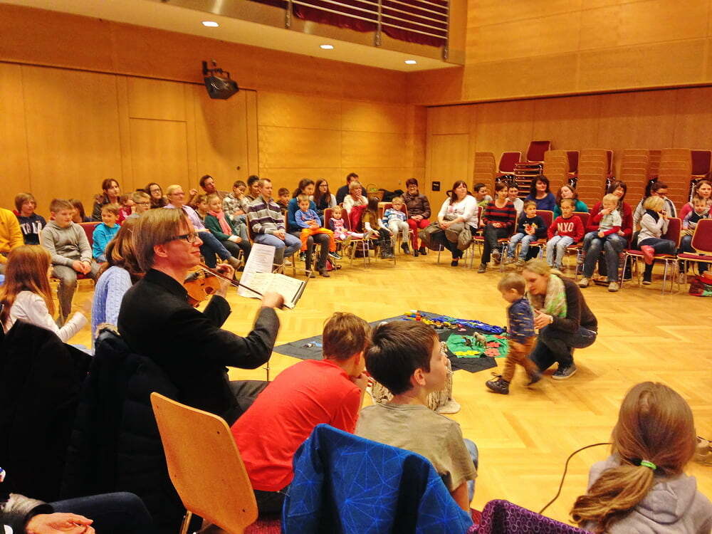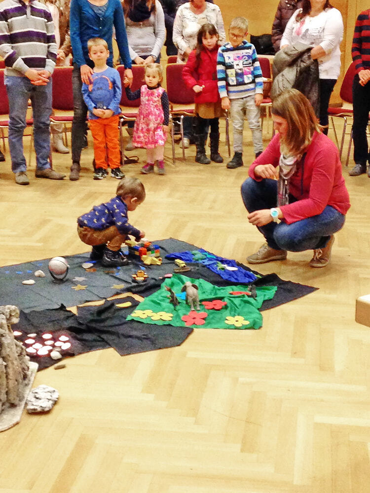 Im Sesselkreis durften die Kinder zuerst die Schöpfungsgeschichte nachspielen: Am Anfang war das „Nichts“ - symbolisiert durch ein schwarzes Tuch. Nach und nach legten die Kinder verschiedenen Materialen auf das Tuch. Sonne, Mond und Sterne, Wasser, Tiere, Blumen, Menschen, Fahrzeuge und Bauwerke. Am Ende der Geschichte entstand unsere WELT als schönes Bodenbild.