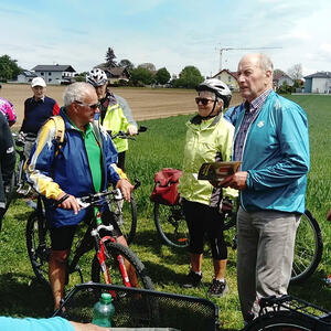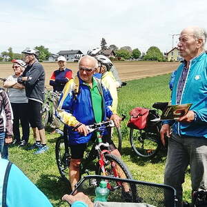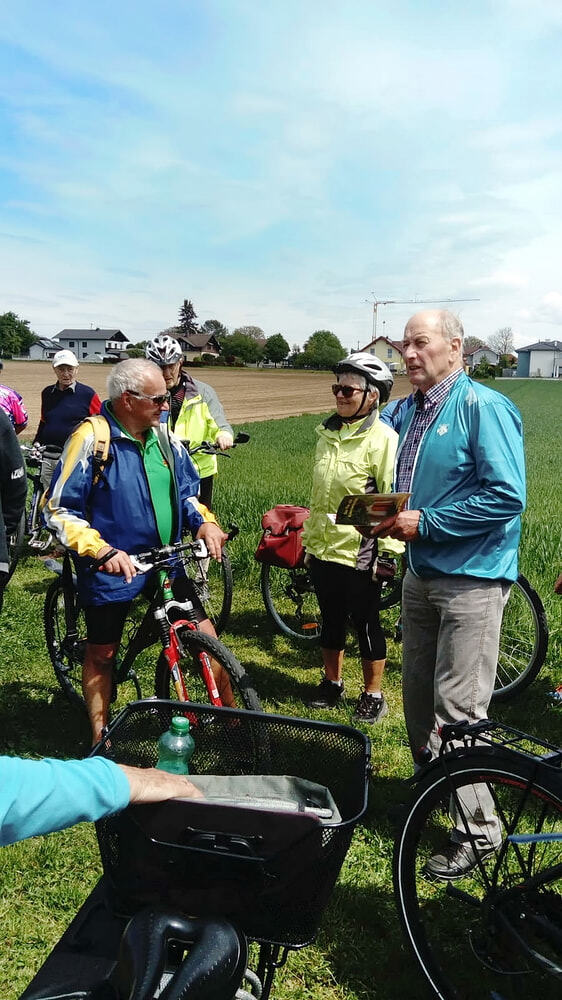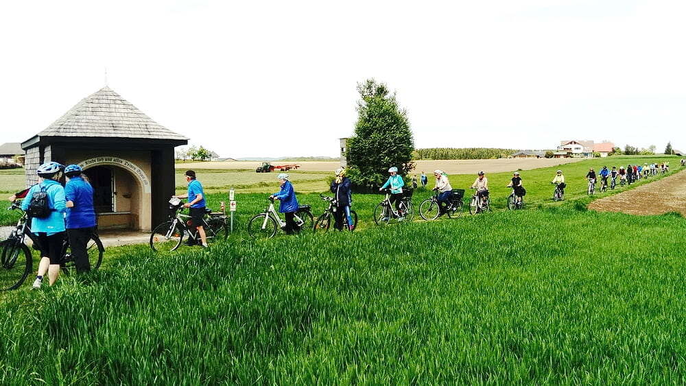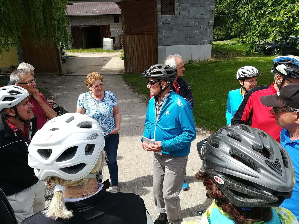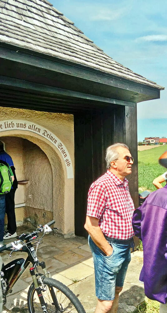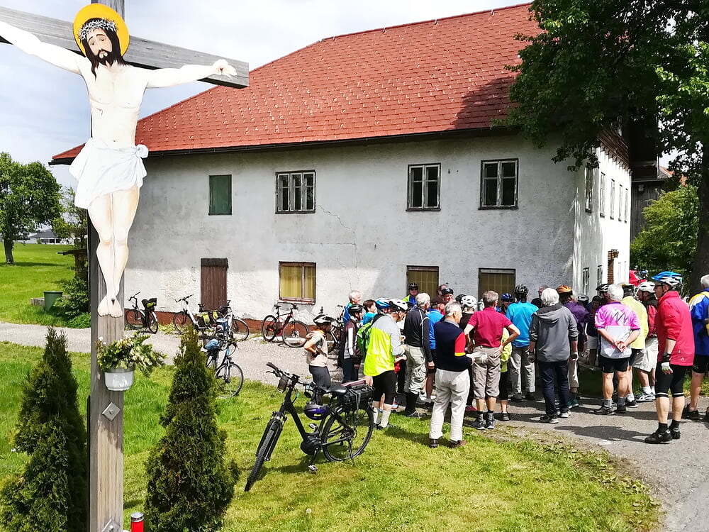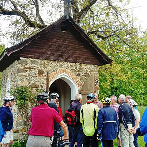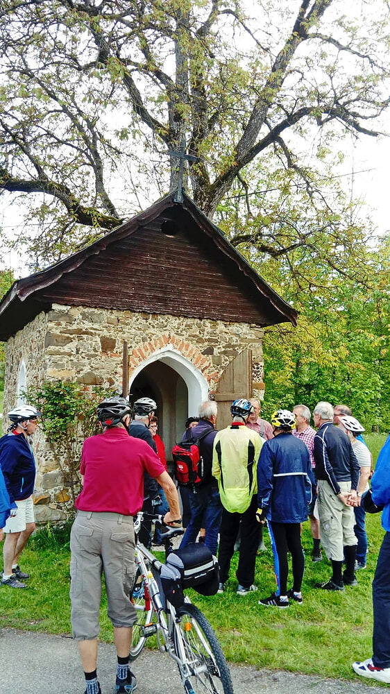 Etwa 40 Teilnehmer radelten bei gutem Radlwetter Richtung Aurach und sogar bis zum Hongar, um auch heuer wieder einige Kleinode zu besuchen. Darunter war auch das älteste Gebäude von Aurach am Hongar, eine Kapelle neben dem Kindergarten.
