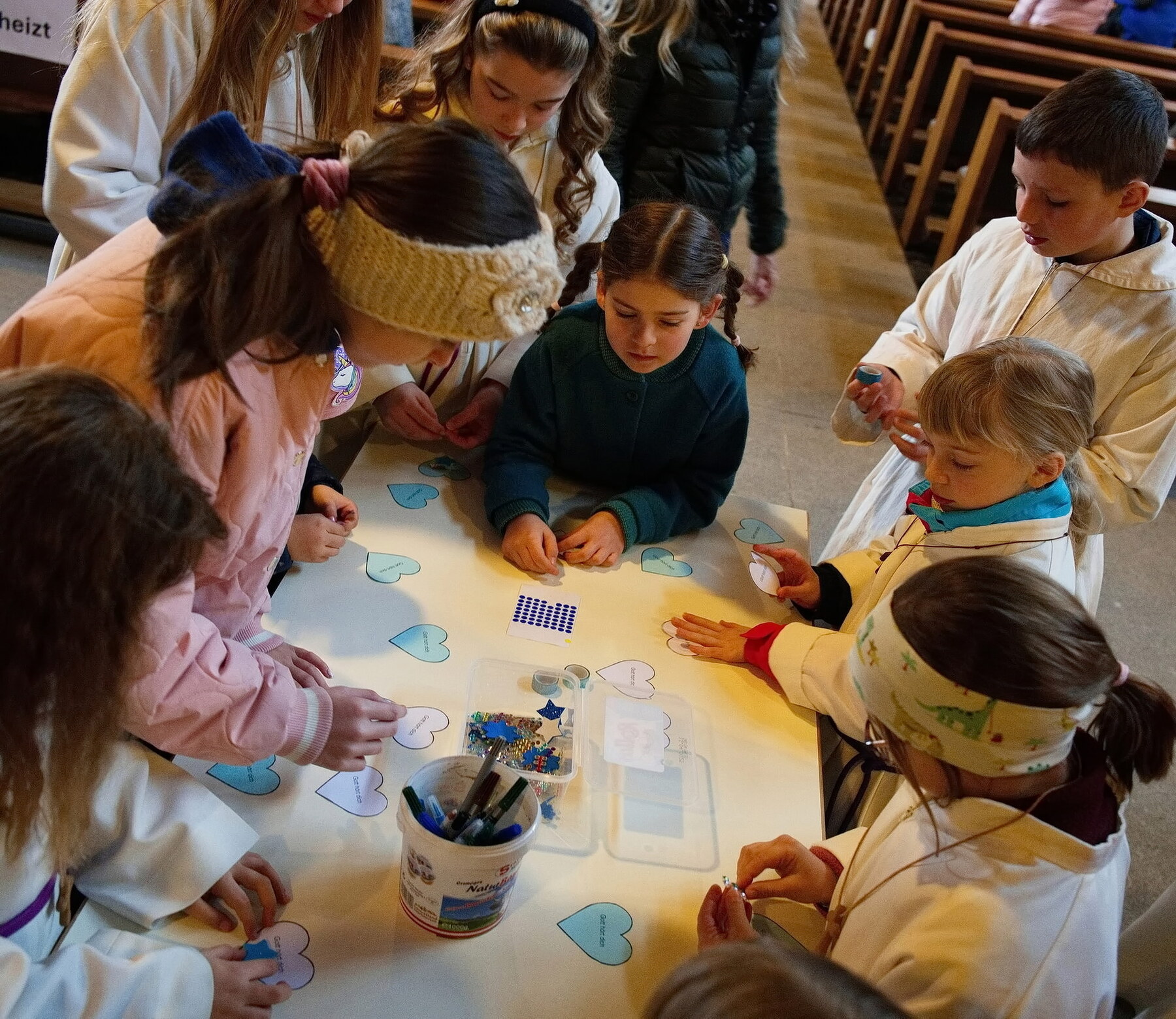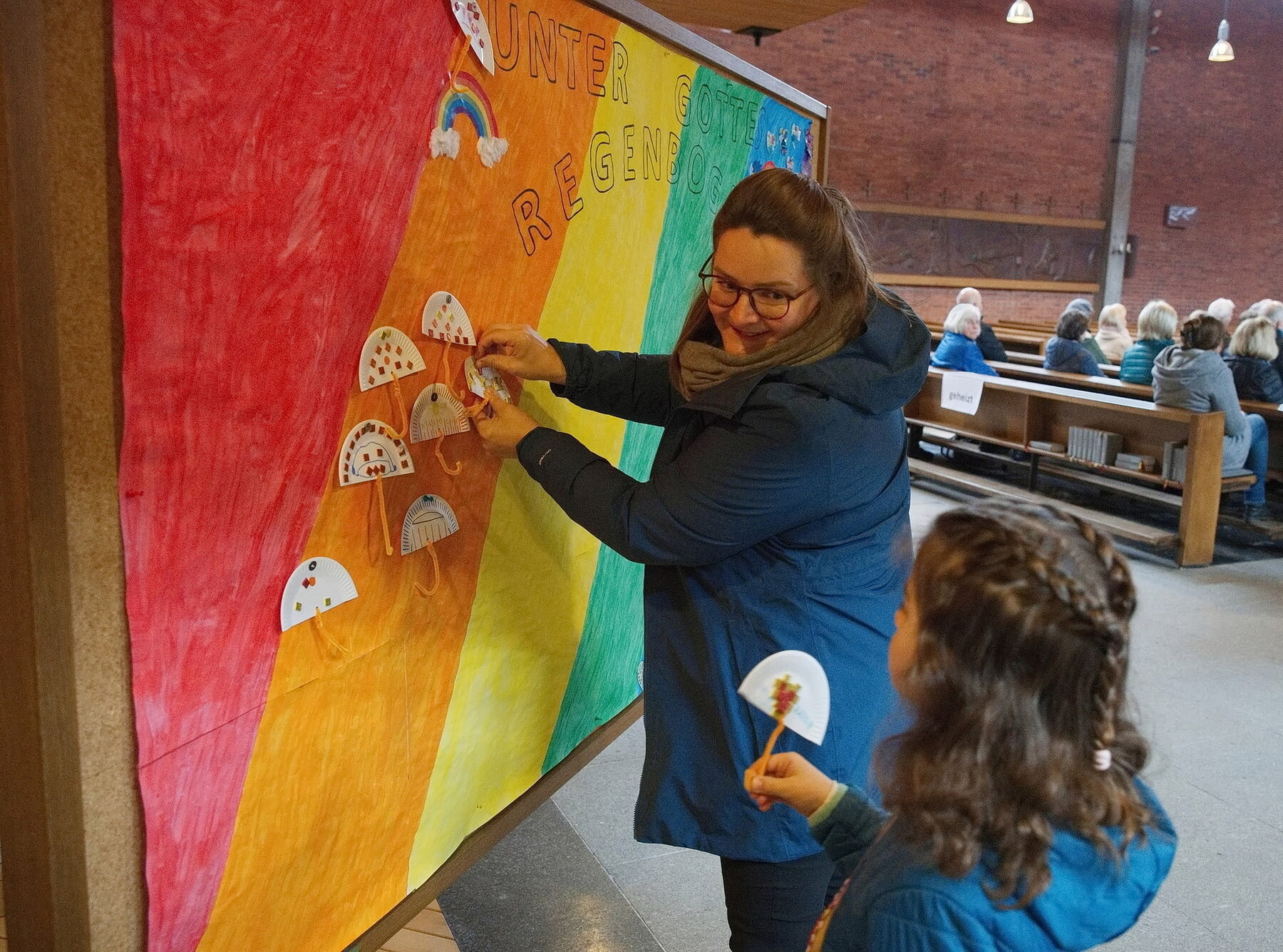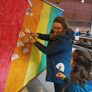 Die Gottesdienste wurden besonders kindgerecht gestaltet. Anschauliche Geschichten, einfache und berührende Botschaften sowie gemeinsames Singen machten die Inhalte für alle Generationen erlebbar. Passend zum jeweiligen Thema durften die Kinder kreativ werden und etwas basteln. Diese Werke wurden anschließend auf einer großen Pinnwand gesammelt, die sich Woche für Woche mehr mit Farben und Leben füllte – ein sichtbares Zeichen unseres gemeinsamen Weges unter Gottes Regenbogen.