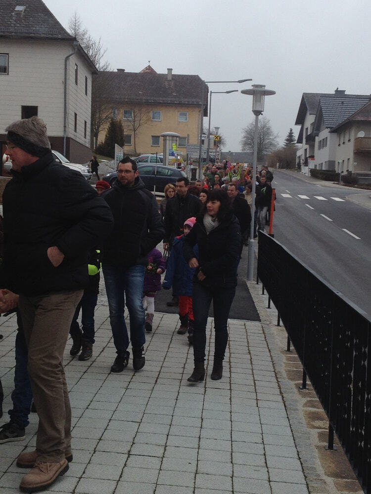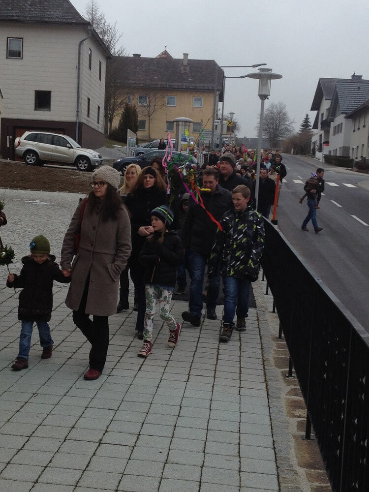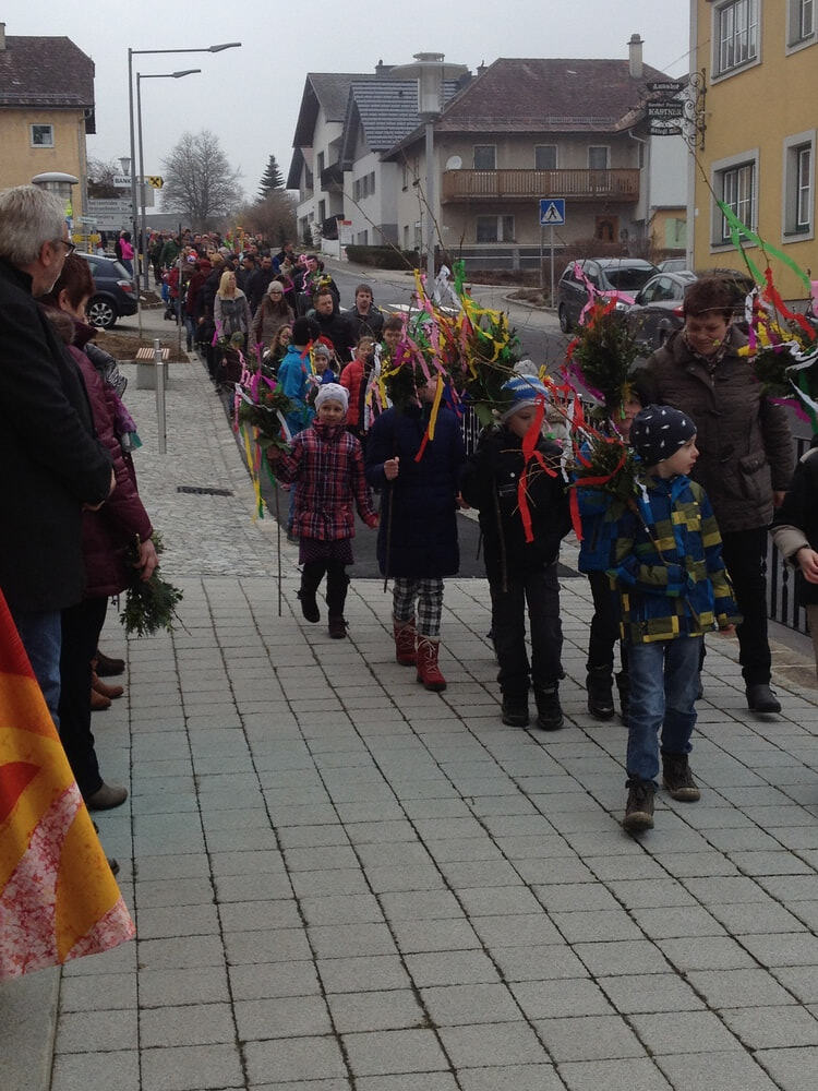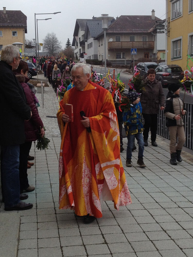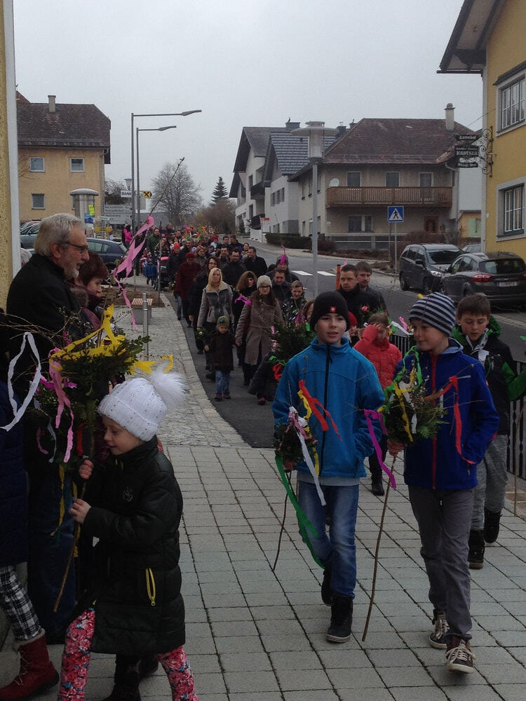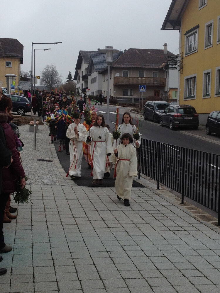 Palmprozesseion: P. Meinrad, Ministranten, die Volksschulkinder und die Pfarrgemeinde ziehen in die Pfarrkirche ein.
