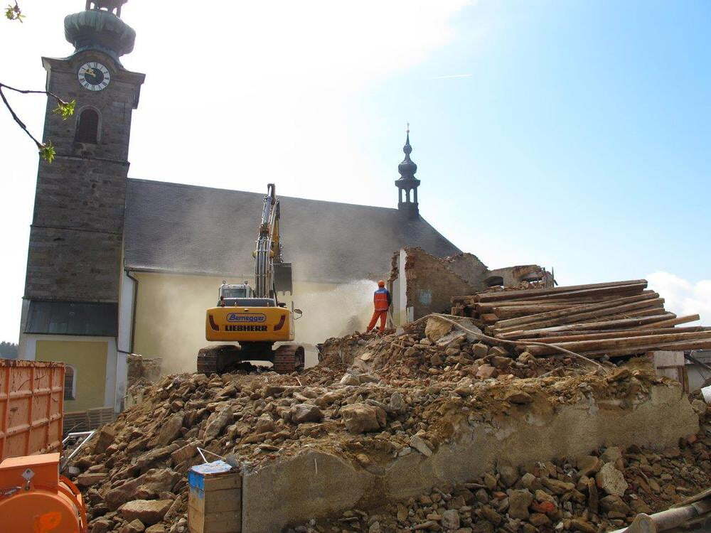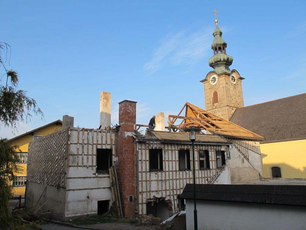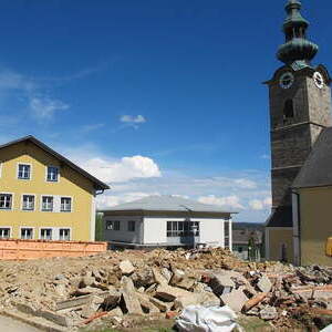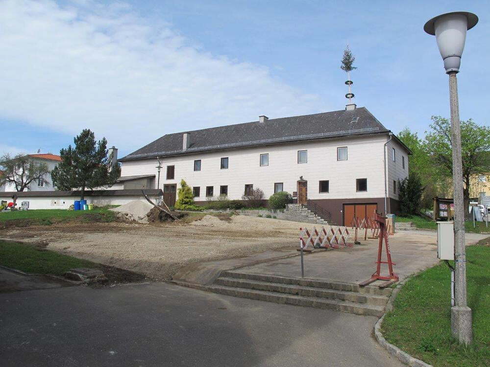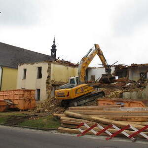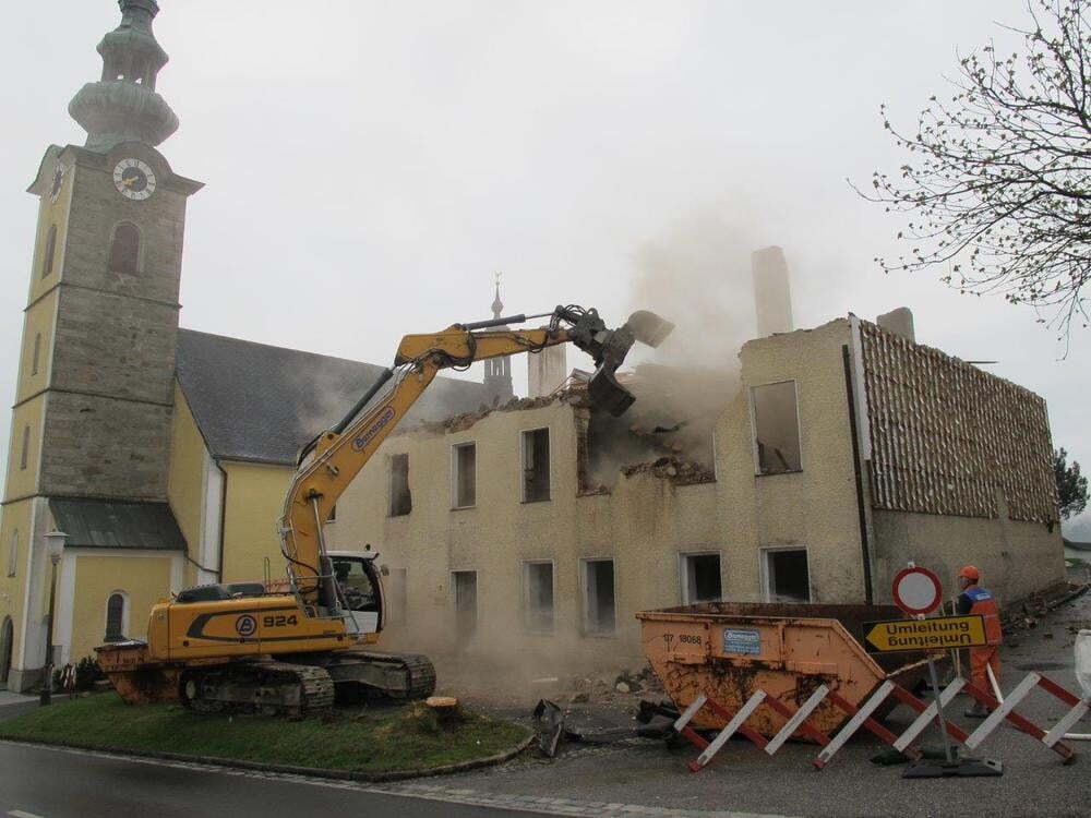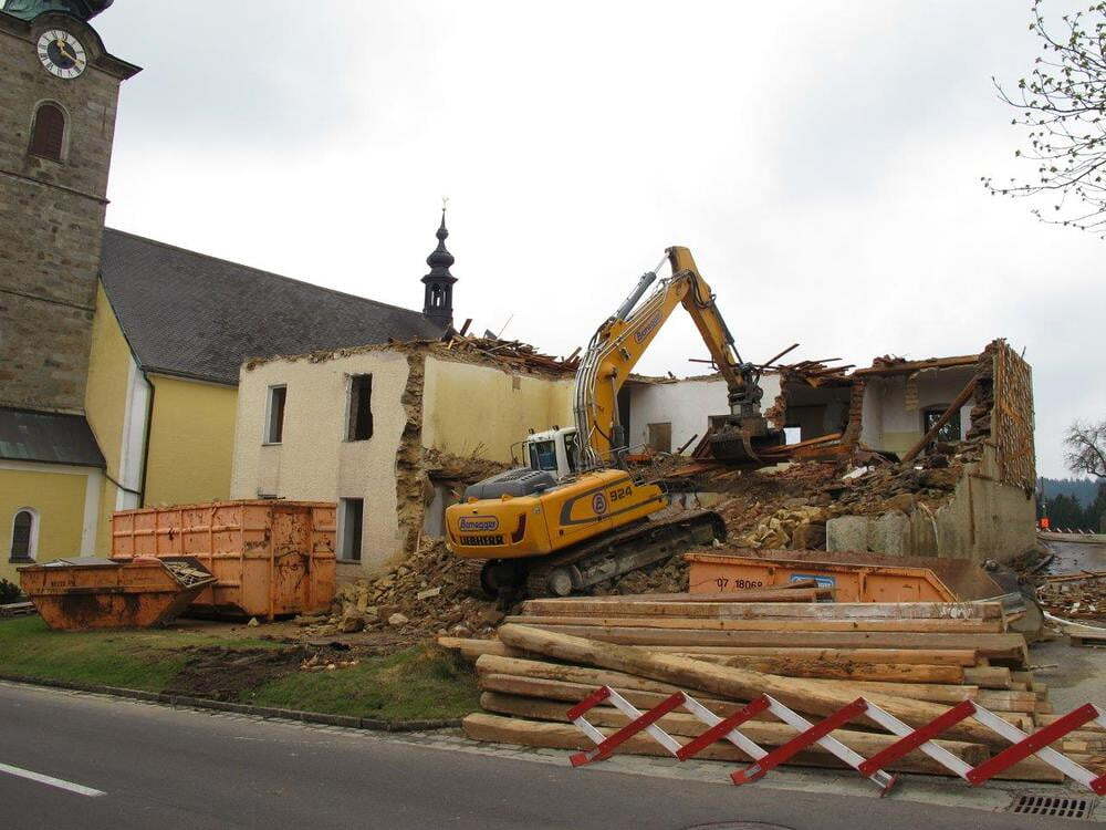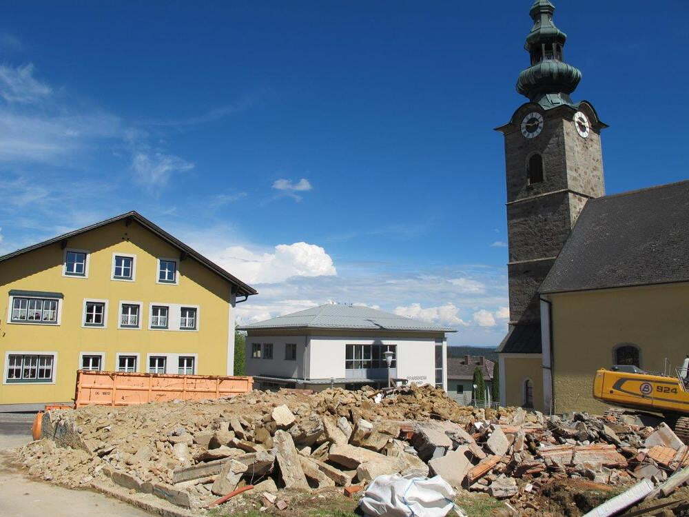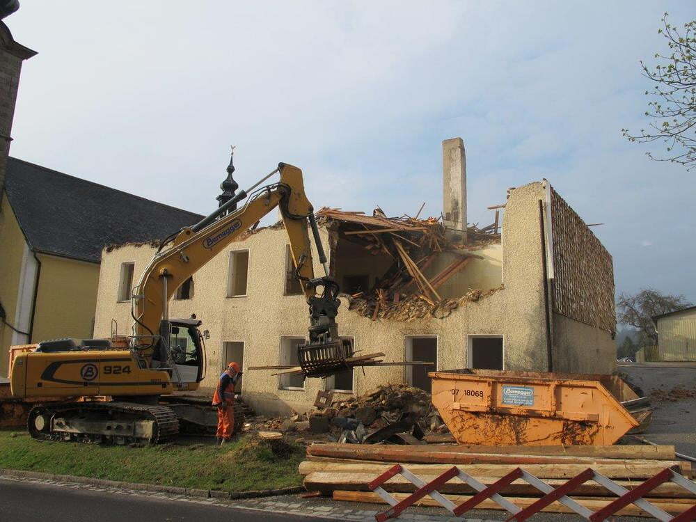 Das alte Schulgebäude und die Aufbahrungshalle muss für den Neubau der Aussegnungshalle und dem neuen Ortsplatz weichen.