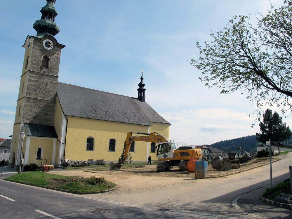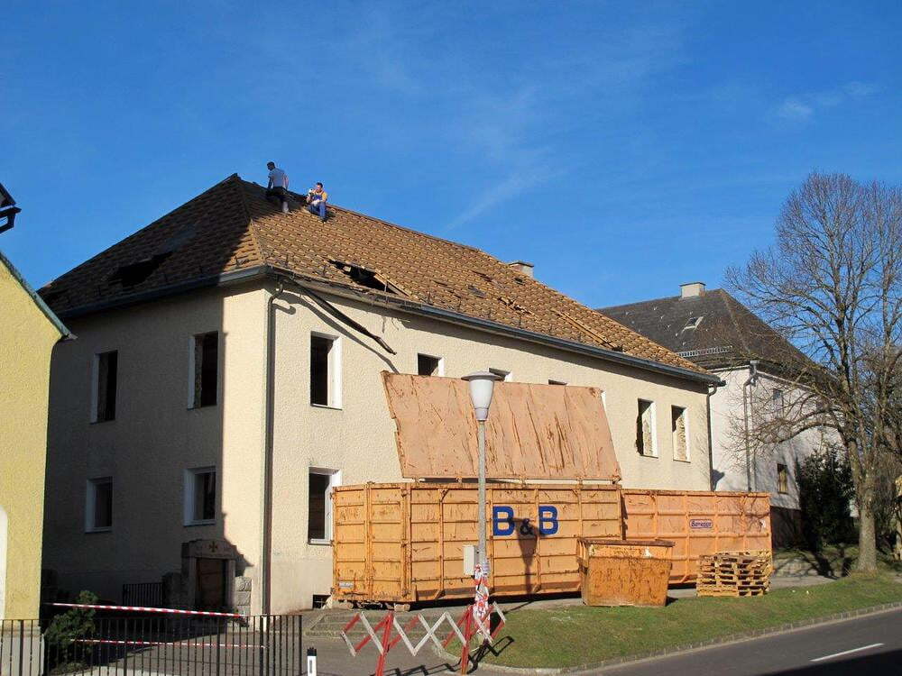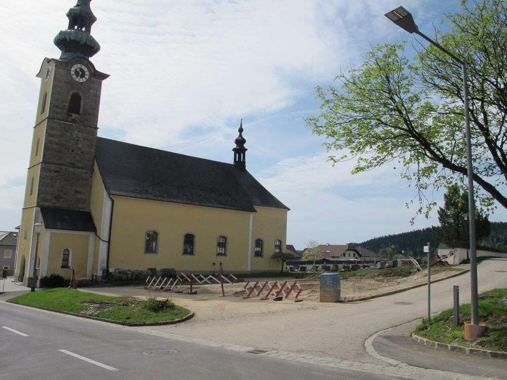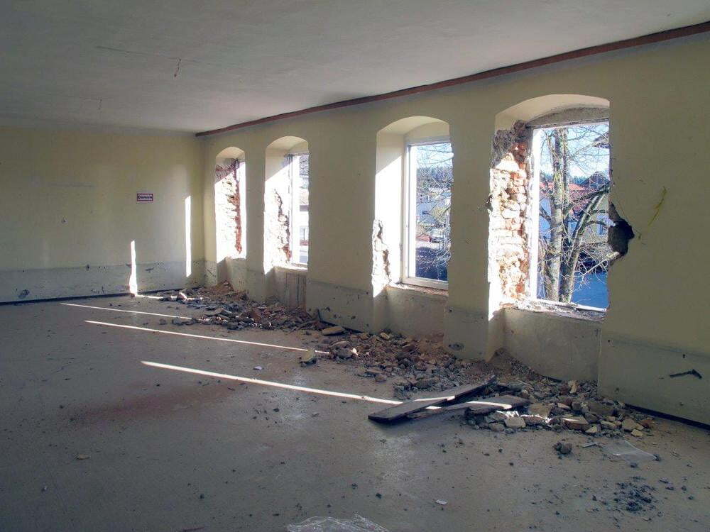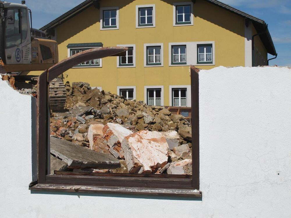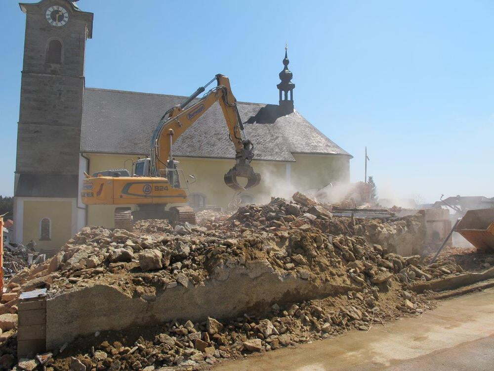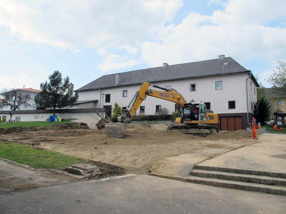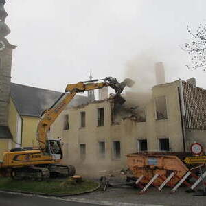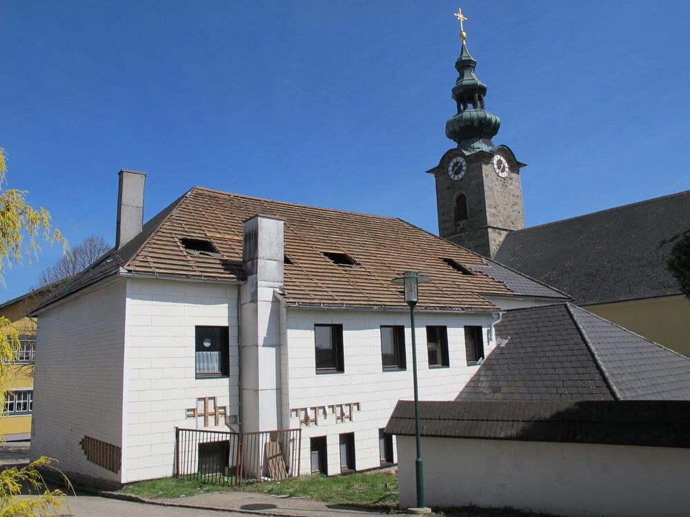 Das alte Schulgebäude und die Aufbahrungshalle muss für den Neubau der Aussegnungshalle und dem neuen Ortsplatz weichen.