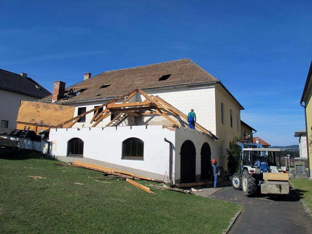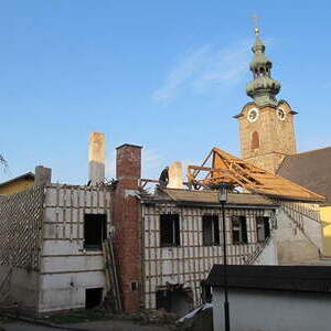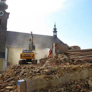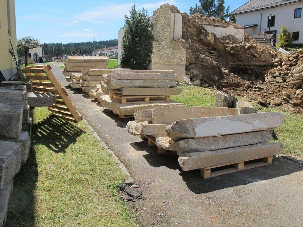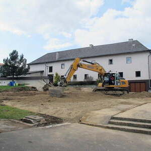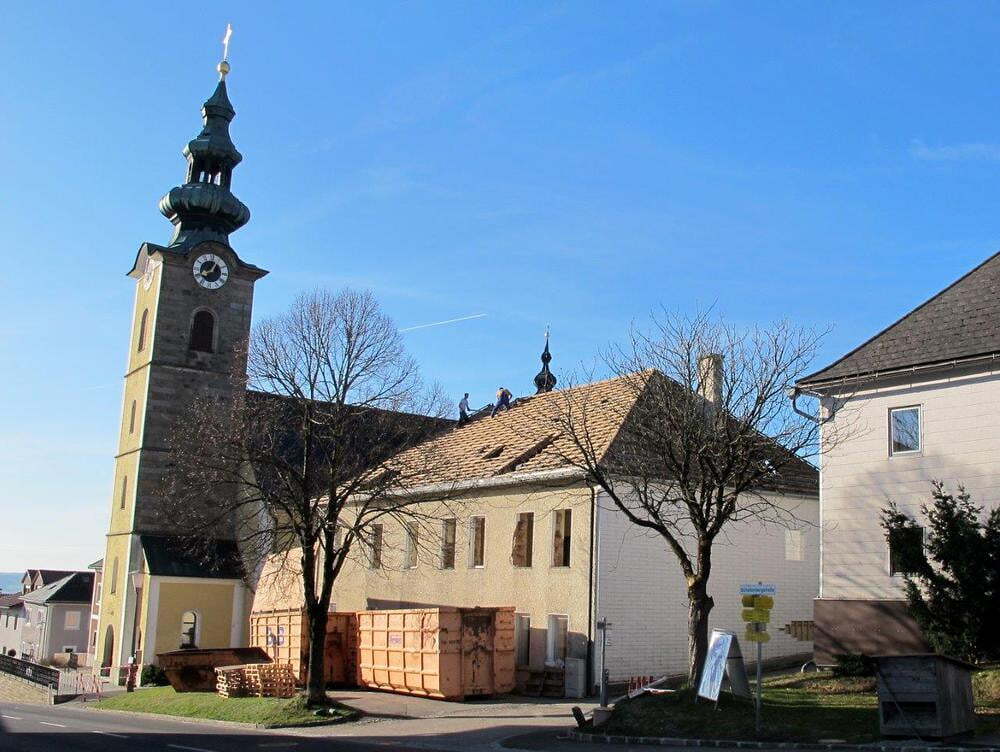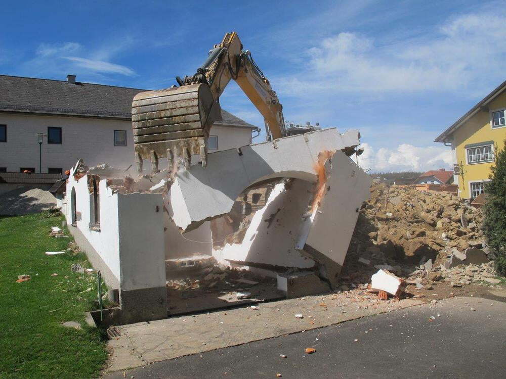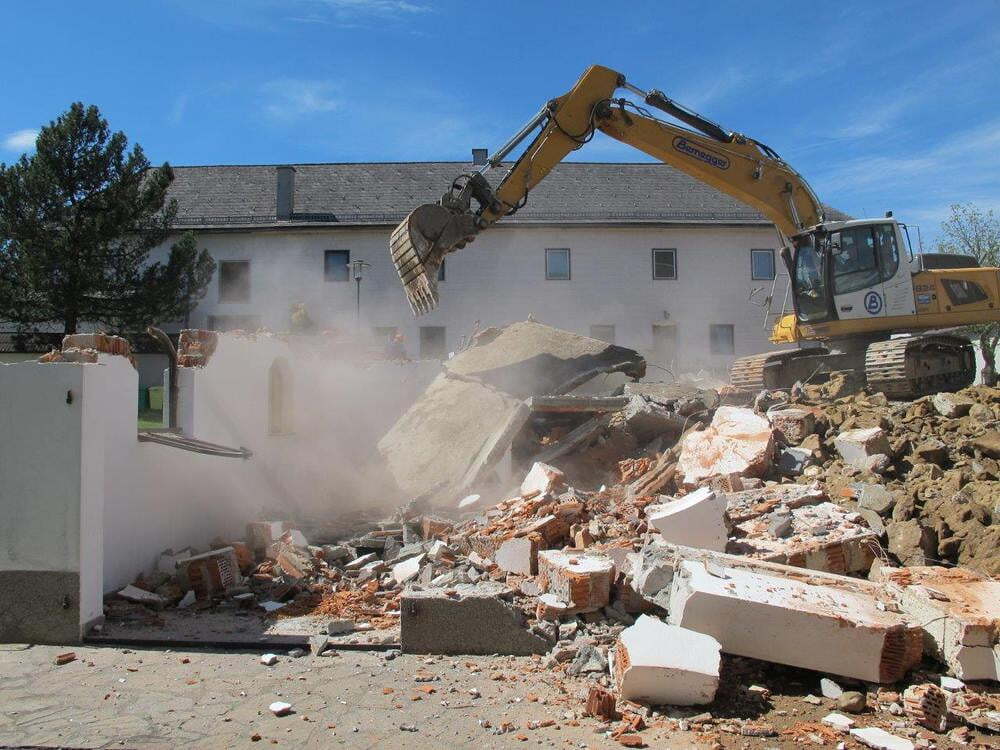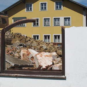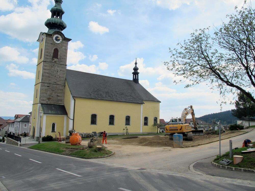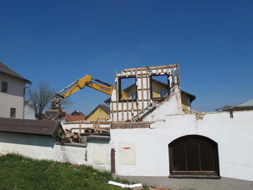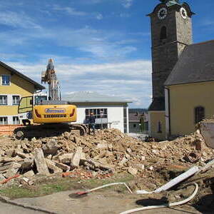Das alte Schulgebäude und die Aufbahrungshalle muss für den Neubau der Aussegnungshalle und dem neuen Ortsplatz weichen.