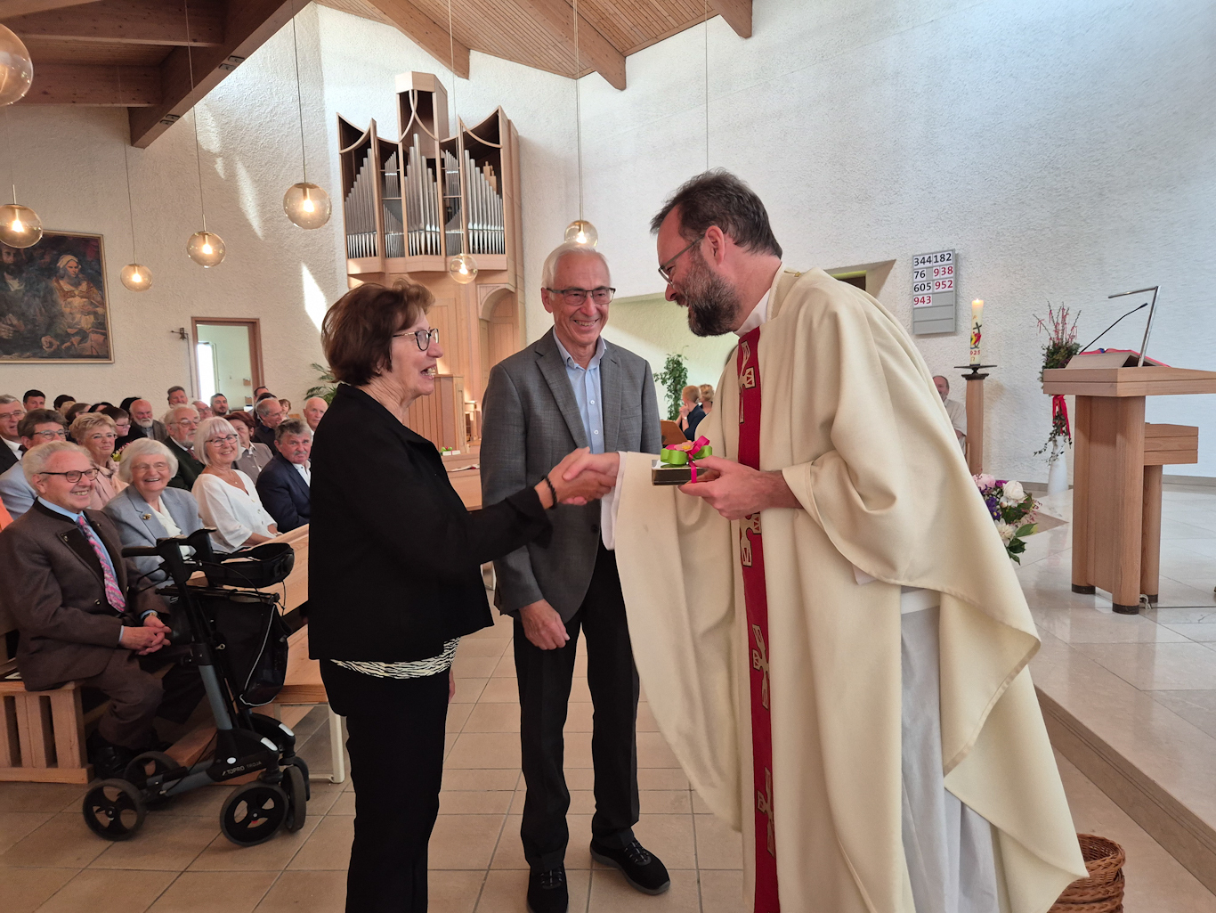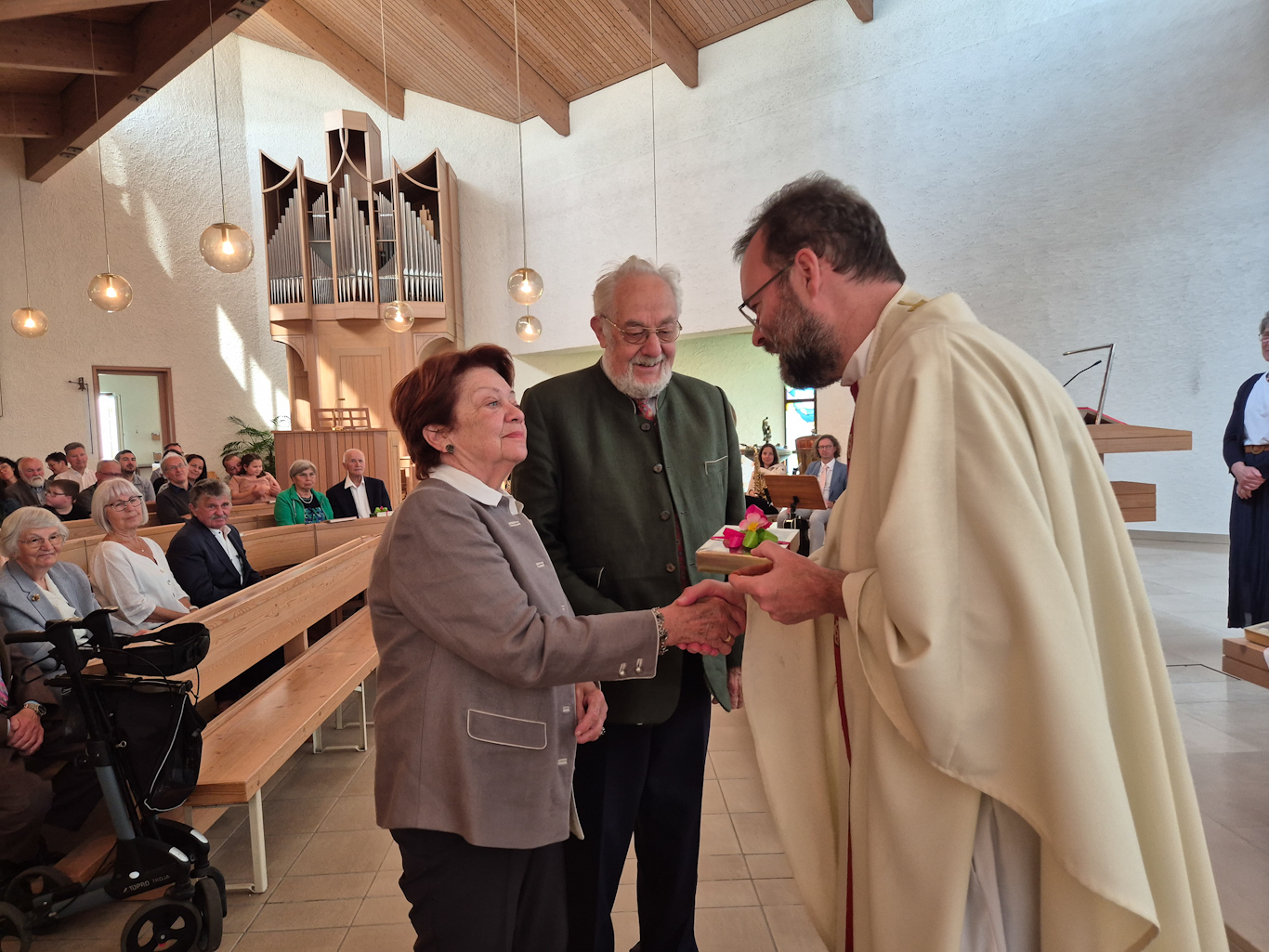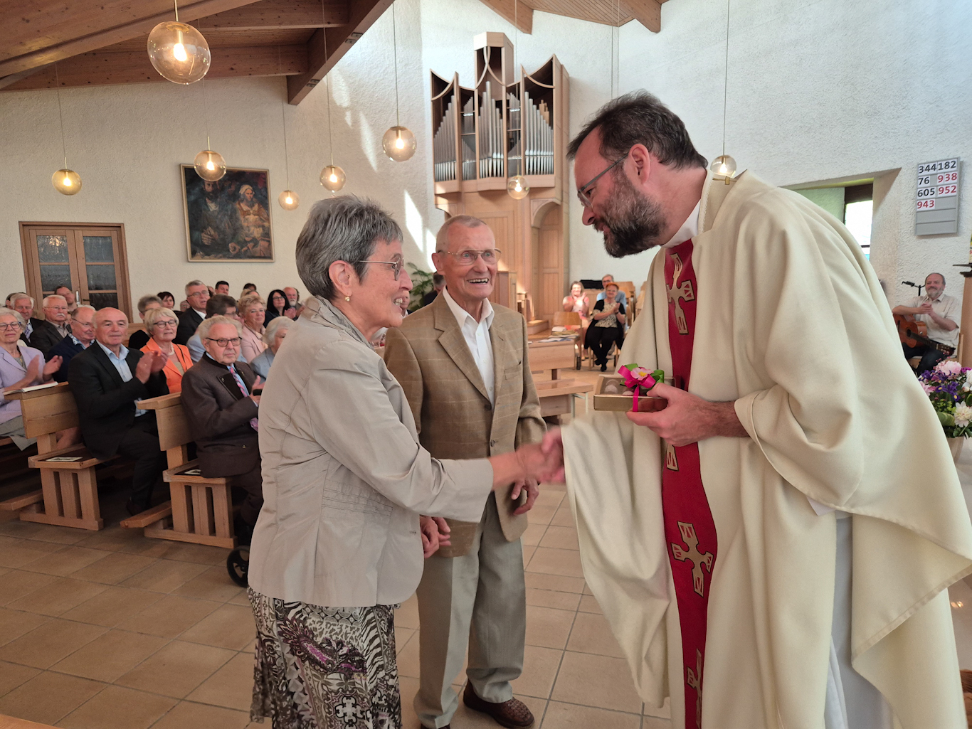 Ein zentraler Teil der Feier war die Segnung durch Kooperator Mag. Peter Ramsebner, der den Jubelpaaren euch ein kleines Geschenk zum Teilen überreicht hat.