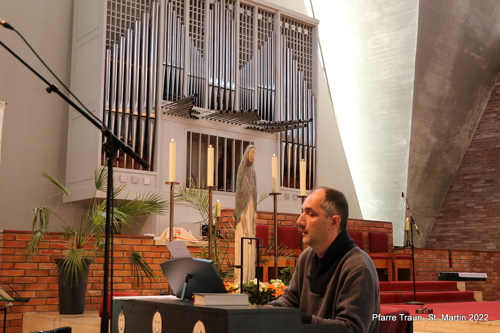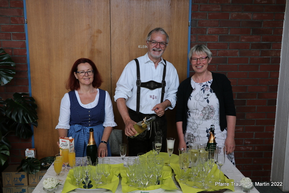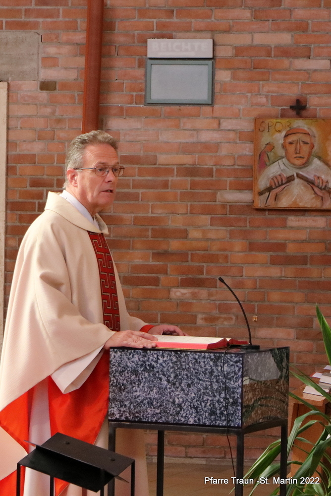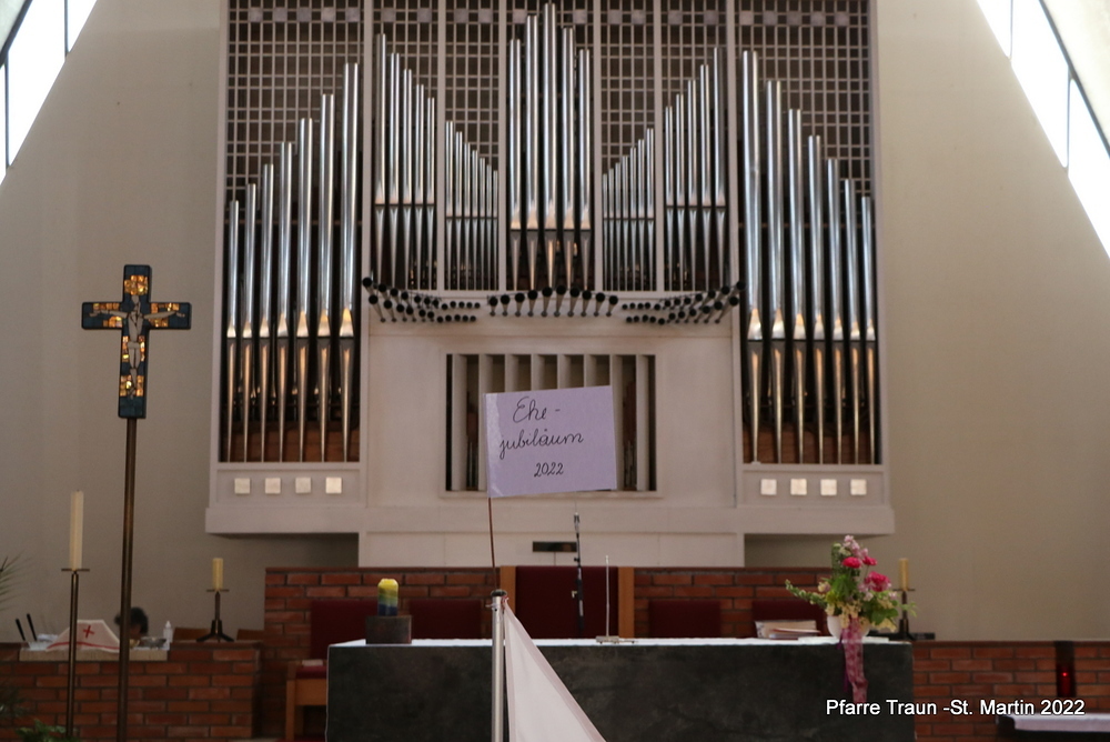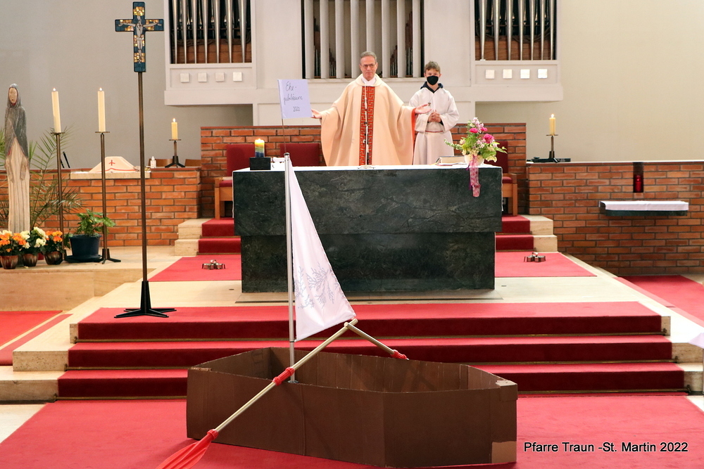 Im Altarraum wurde ein Boot aufgestellt. Das Eheleben verglichen wir mit einer Bootsfahrt, die harmonisch, stürmisch, hohe Wellen schlagend aber danach wieder ruhig und erholsam sein kann. Musikalisch wurde die Messe durch den Singkreis gestaltet.