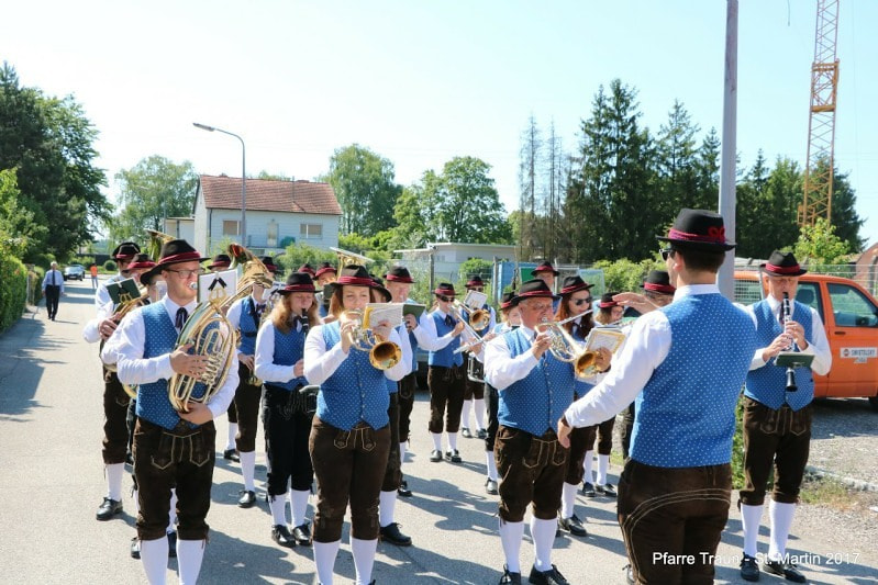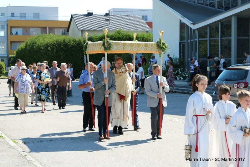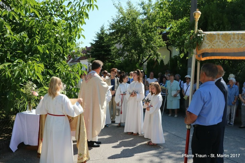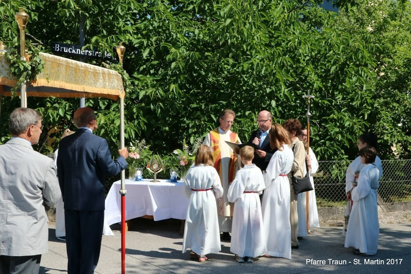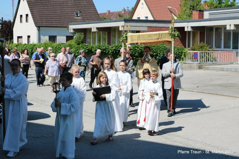 Am Fronleichnamsfest zogen wir nach dem Festgottesdienst in einer festlichen Prozession mit der Trachtenkapelle, den Ministranten, dem „Himmel“ und den Gottesdienstteilnehmern durch die Straßen von St. Martin und baten um den Segen für unsere Stadt und ihre Bewohner.